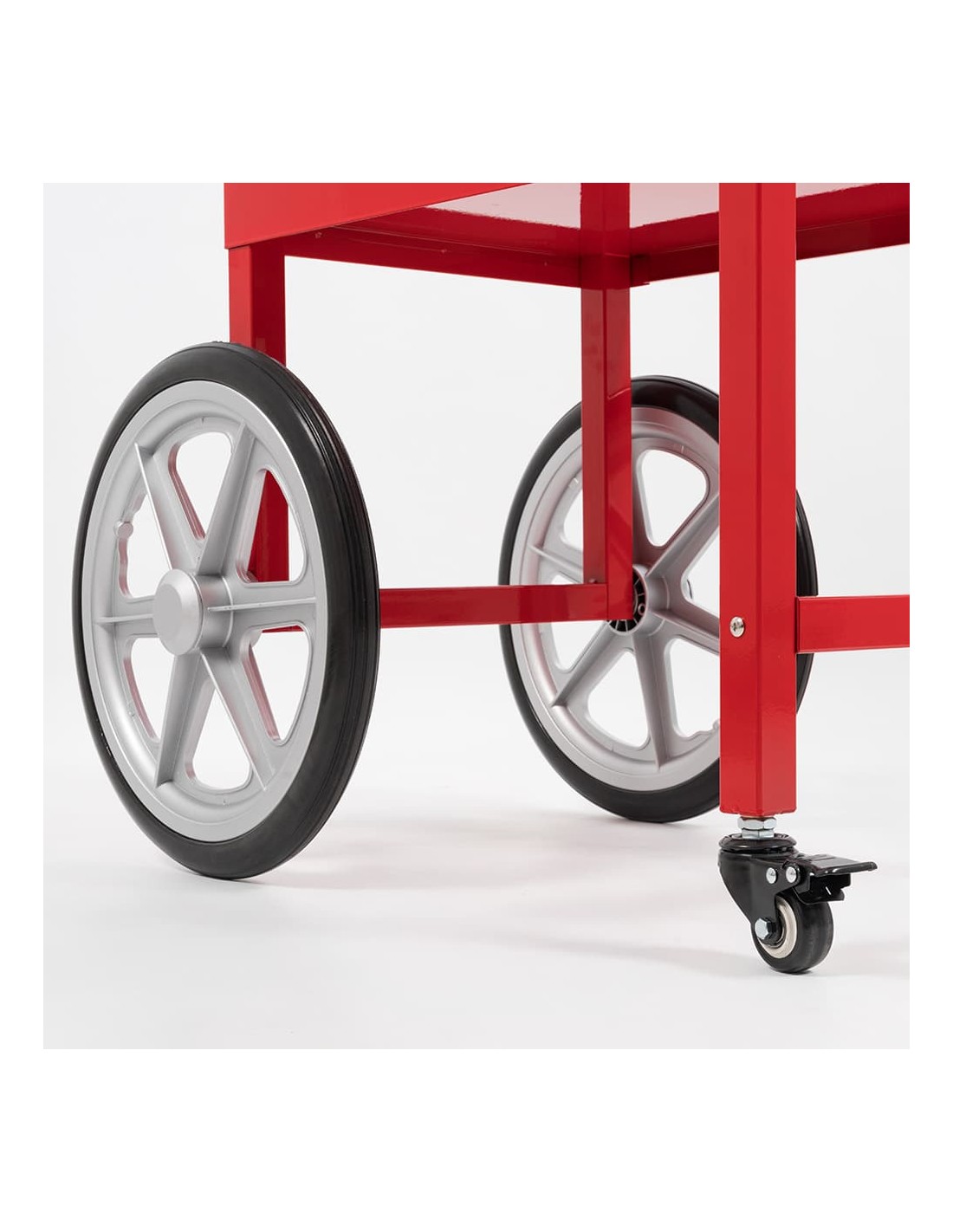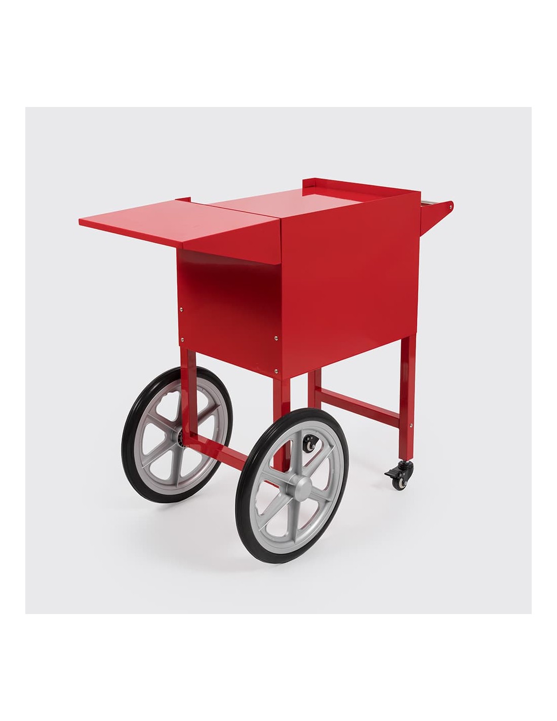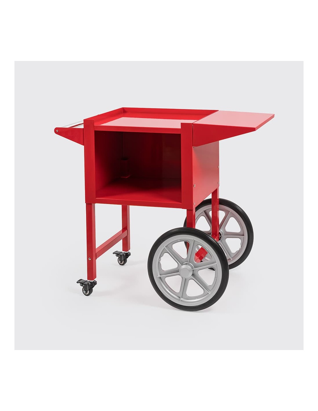 Fabricado en acero lacado en color rojo, este carrito ofrece una estructura robusta, resistente y duradera, ideal para uso intensivo. Su diseño llamativo no solo aporta estabilidad, sino también un fuerte impacto visual que ayuda a atraer clientes en ferias, fiestas, cines o puntos de venta.