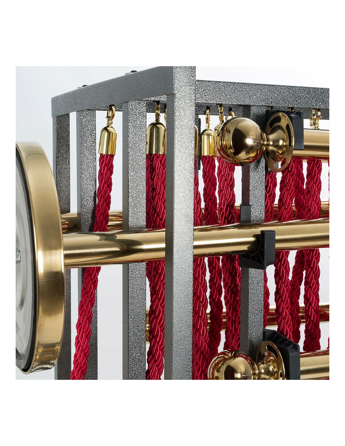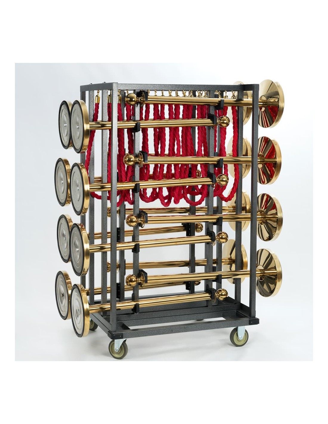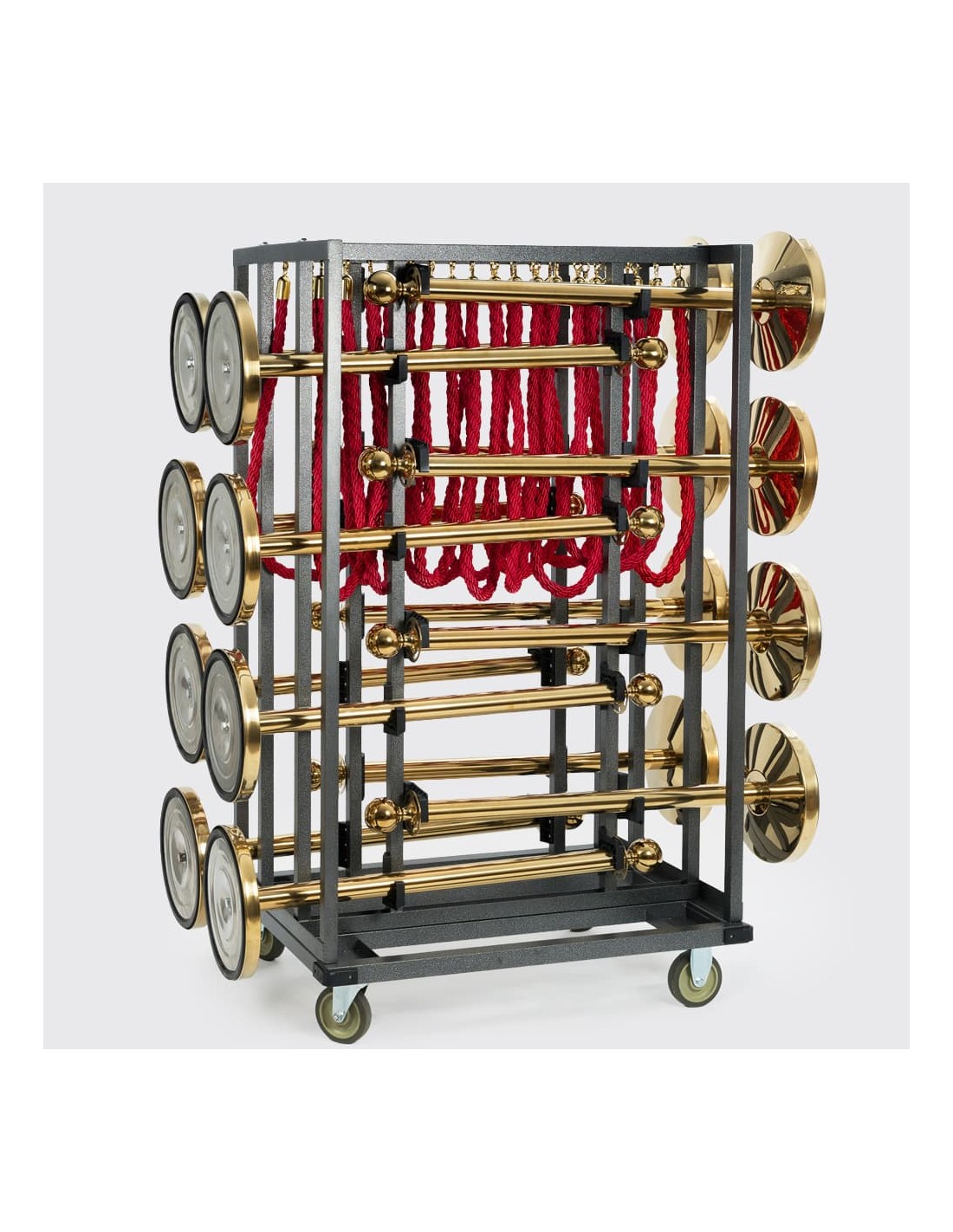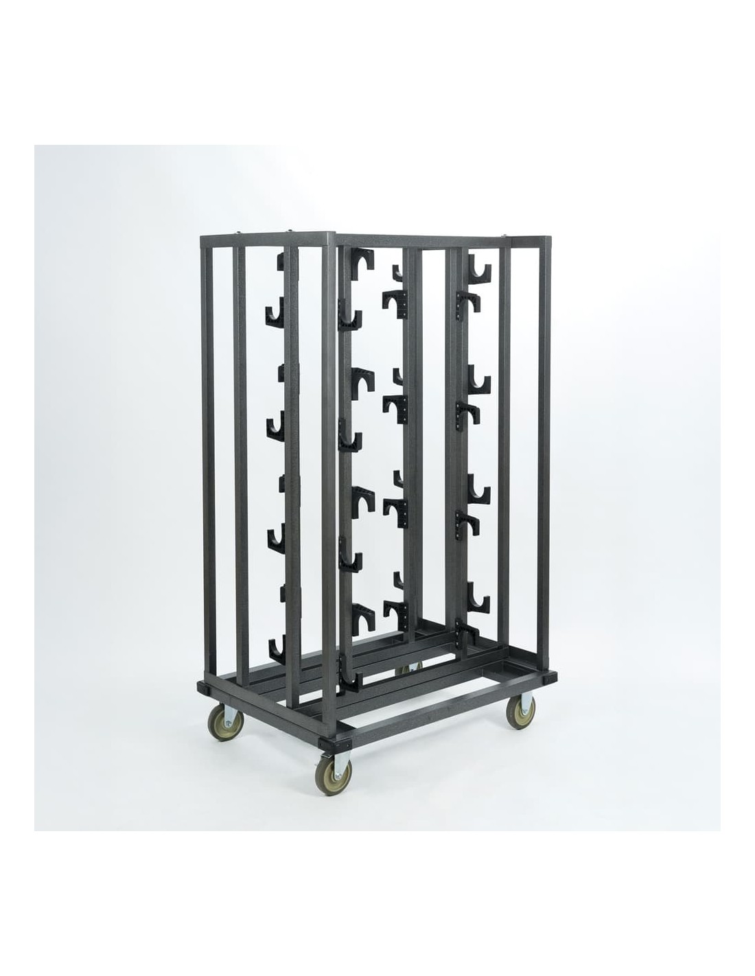 Sus dimensiones son 100 cm de largo, 153,9 cm de alto y 74 cm de profundidad, con un peso de 32 kg. Fabricado en tubo cuadrado de acero lacado en gris 30x30 mm, garantiza resistencia y durabilidad en cualquier entorno. Sus ruedas de 12,7 cm de diámetro (2 giratorias con freno y 2 fijas sin freno) facilitan el desplazamiento seguro incluso con carga completa.
