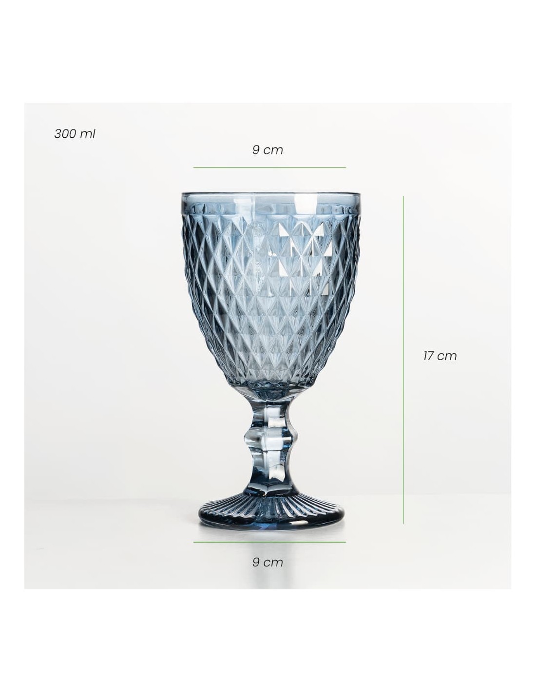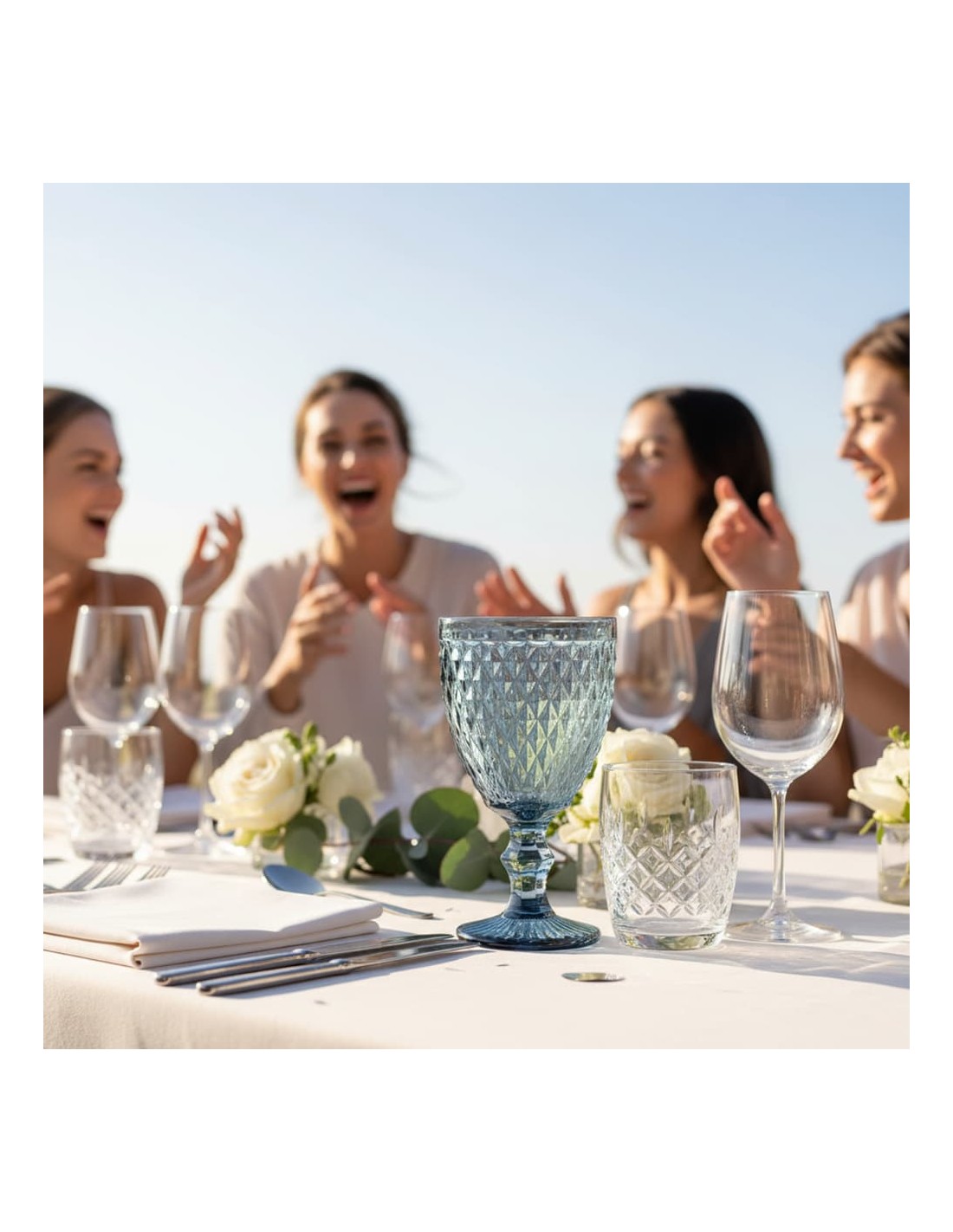 Disponibles en una gama de colores vibrantes como azul, púrpura, azul agua marina, verde oliva y ámbar, no solo son un deleite visual, sino que también prometen una experiencia de bebida superior. Su diseño labrado aporta un toque dulce, romántico y vintage, que resalta en cualquier mesa y agrega un encanto especial a la ocasión.