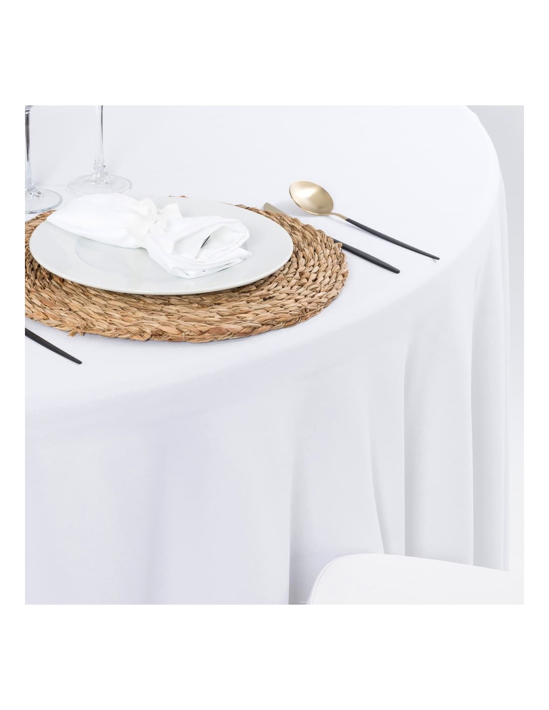 Este mantel, en un elegante color blanco, es la elección perfecta para eventos formales, brindando una presentación impecable y sofisticada a cualquier mesa redonda.