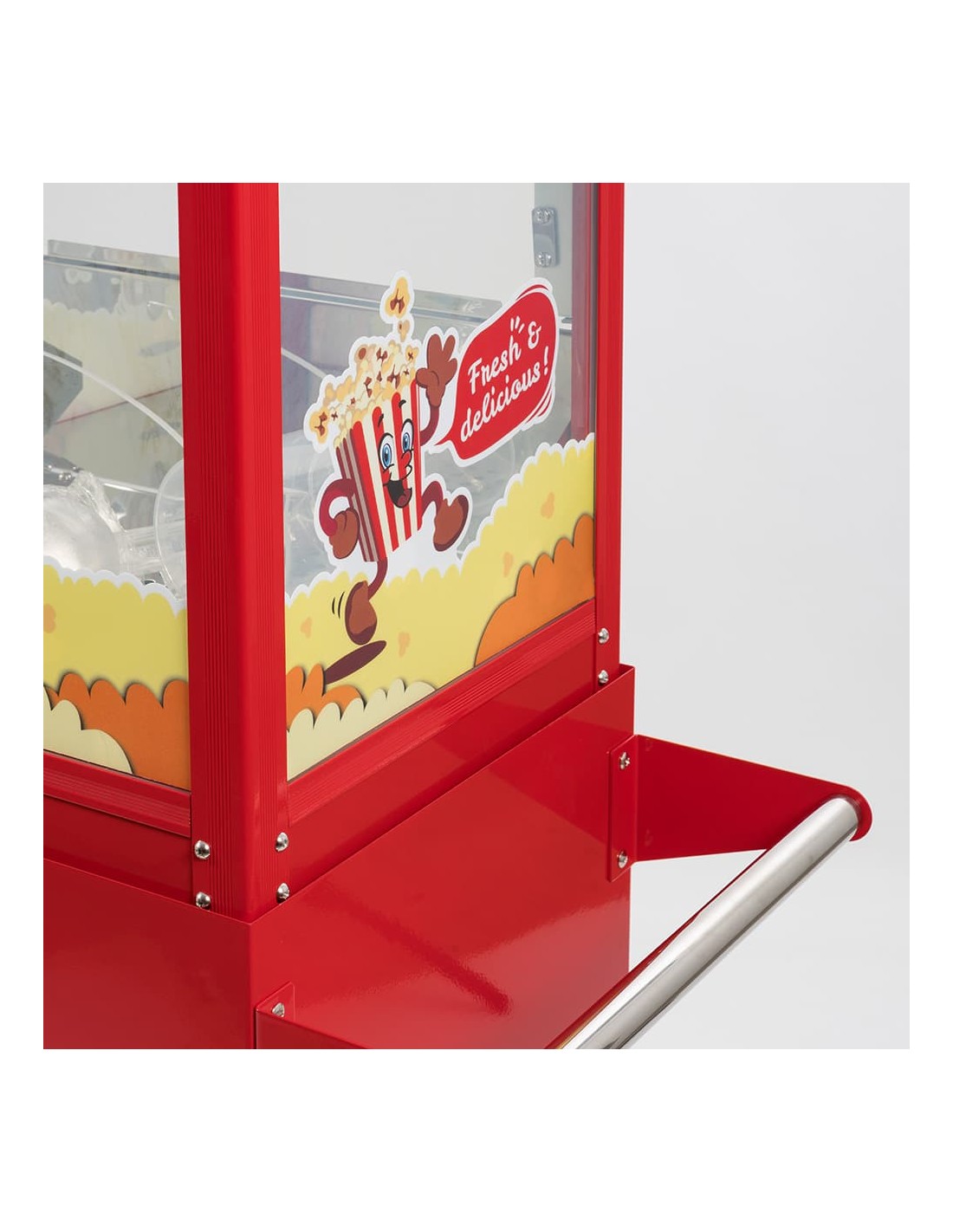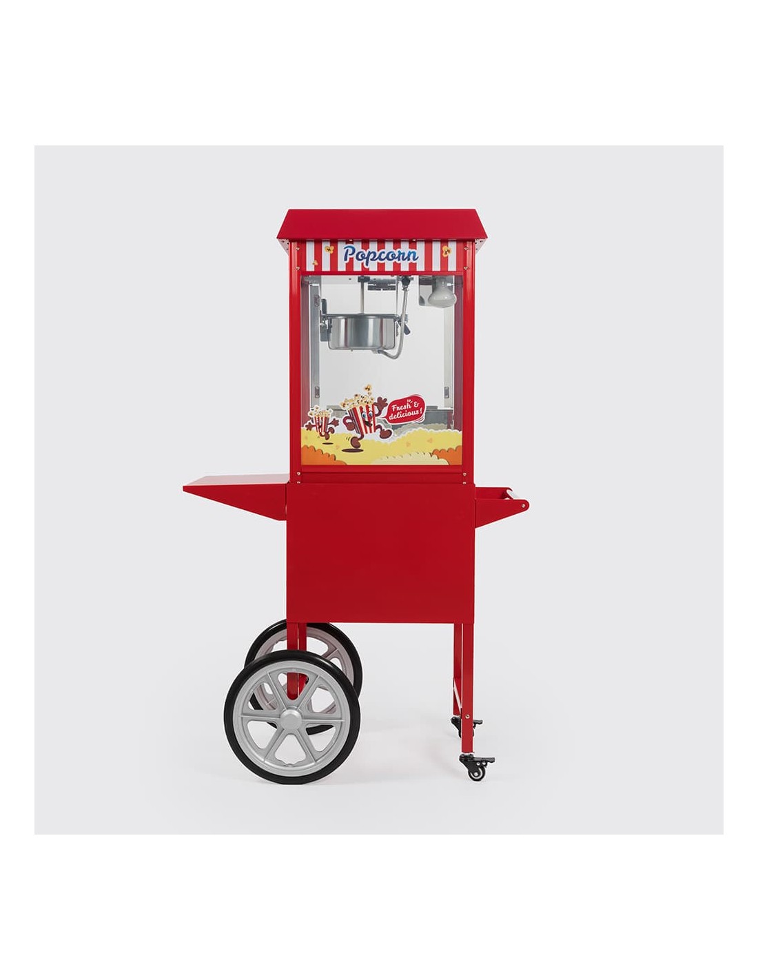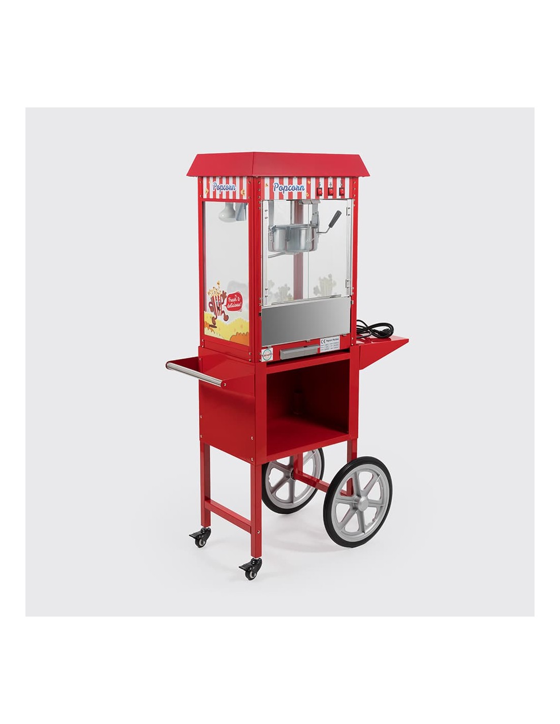 Con unas dimensiones de 95 cm de largo, 48 cm de ancho y 156 cm de alto (incluyendo el carrito), ofrece una producción de hasta 5 kg de palomitas por hora gracias a su potente motor de 1350 W. Fabricada en acero inoxidable lacado, está equipada con una olla antiadherente de teflón y una balda lateral que facilitan la operación.