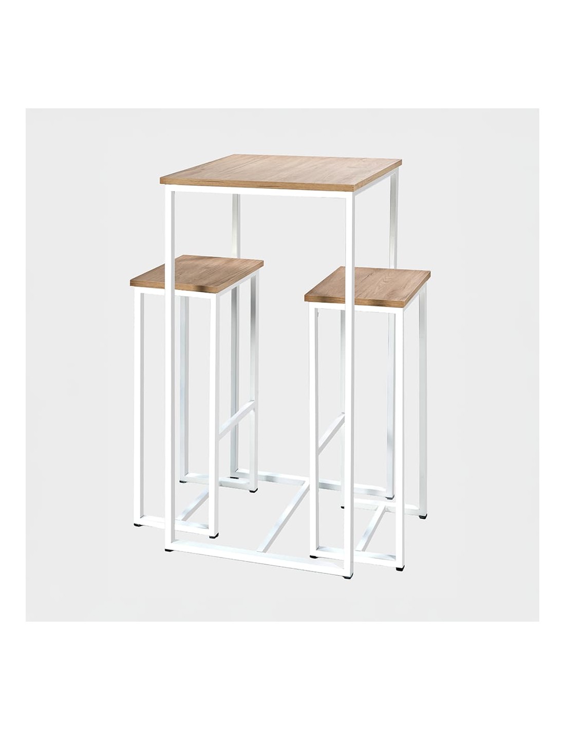 Fabricado con una estructura de madera contrachapada en color Roble Natural y metal VVG, este conjunto ofrece una capacidad de carga de 120 kg por taburete y 60 kg para la mesa, garantizando así su resistencia y durabilidad. Con un peso total de 15 kg, este conjunto es fácil de mover y reubicar según tus necesidades.