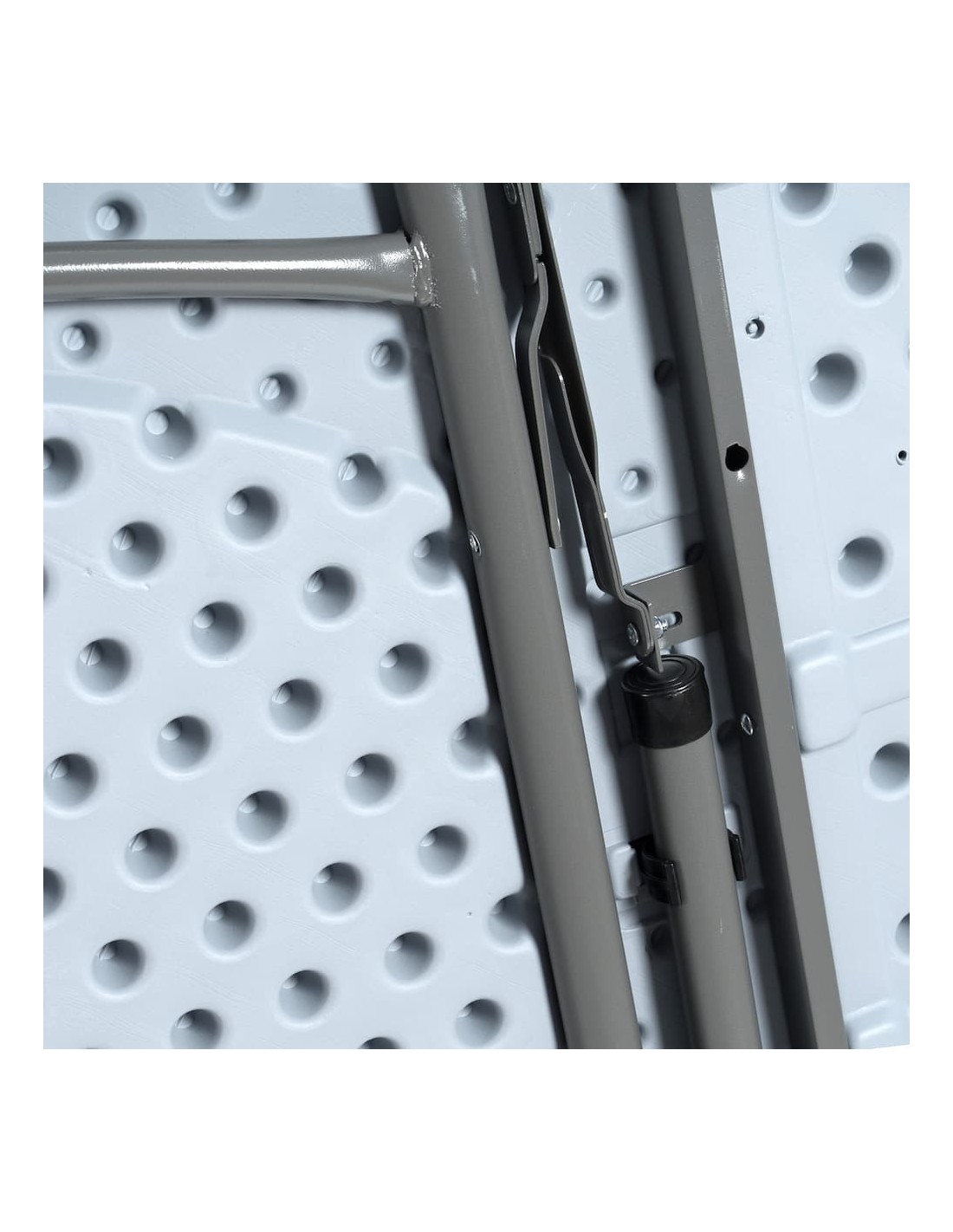 Su estructura está fabricada en acero lacado de 30 mm de diámetro, y cuenta con un tablero de 50 mm de grosor en polietileno de alta densidad, con un tratamiento especial Anti UV que asegura su durabilidad y resistencia, incluso en exteriores. El peso total de la mesa es de 18,5 kg.