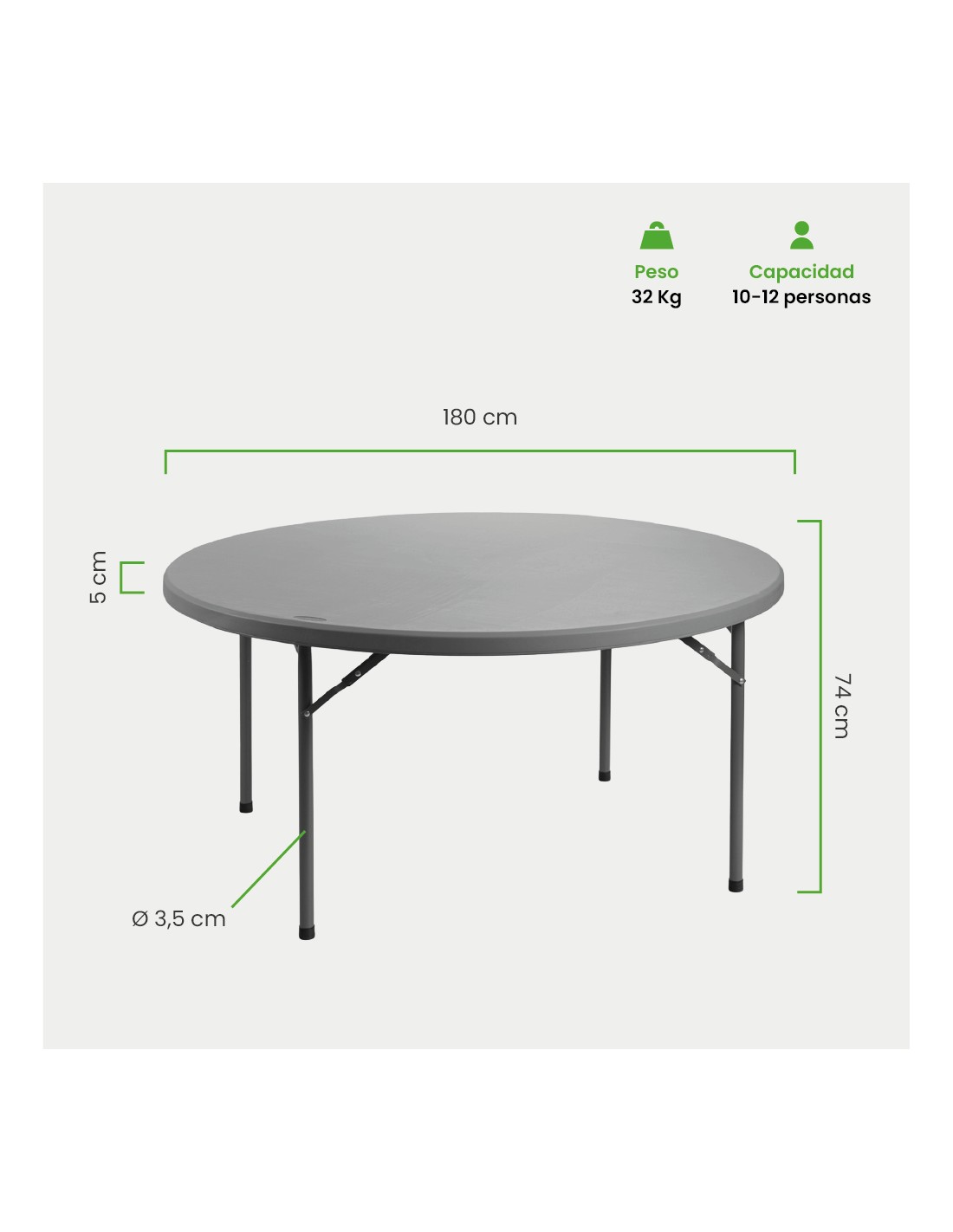 Sus medidas son 180 cm de diámetro y 74 cm de alto, con un peso aproximado de 32 kg. Gracias a su amplio formato, esta mesa redonda tiene capacidad para 10 a 12 personas, por lo que resulta ideal para bodas, banquetes, ferias, caterings, reuniones y eventos corporativos. Además, su tablero incorpora tratamiento anti-UV, lo que ayuda a conservar su rendimiento frente al uso intensivo y la exposición solar.