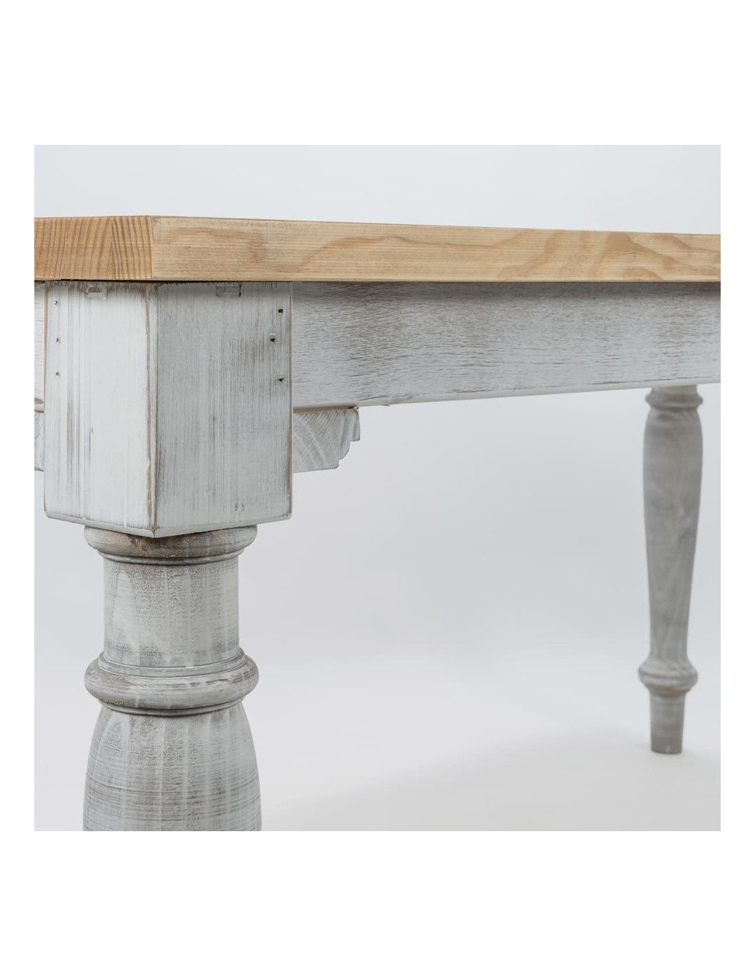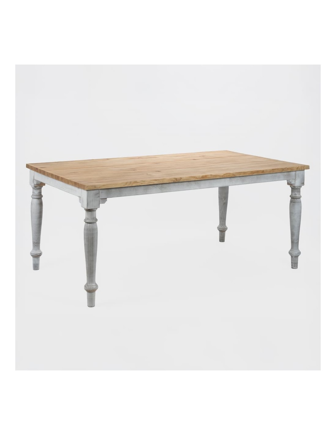 La estructura de la mesa cuenta con 4 patas desmontables de madera de pino en color blanco desgastado, también personalizables, con un diámetro de 9 cm cada una. Este diseño combina robustez con elegancia, siendo ideal para una amplia variedad de entornos.