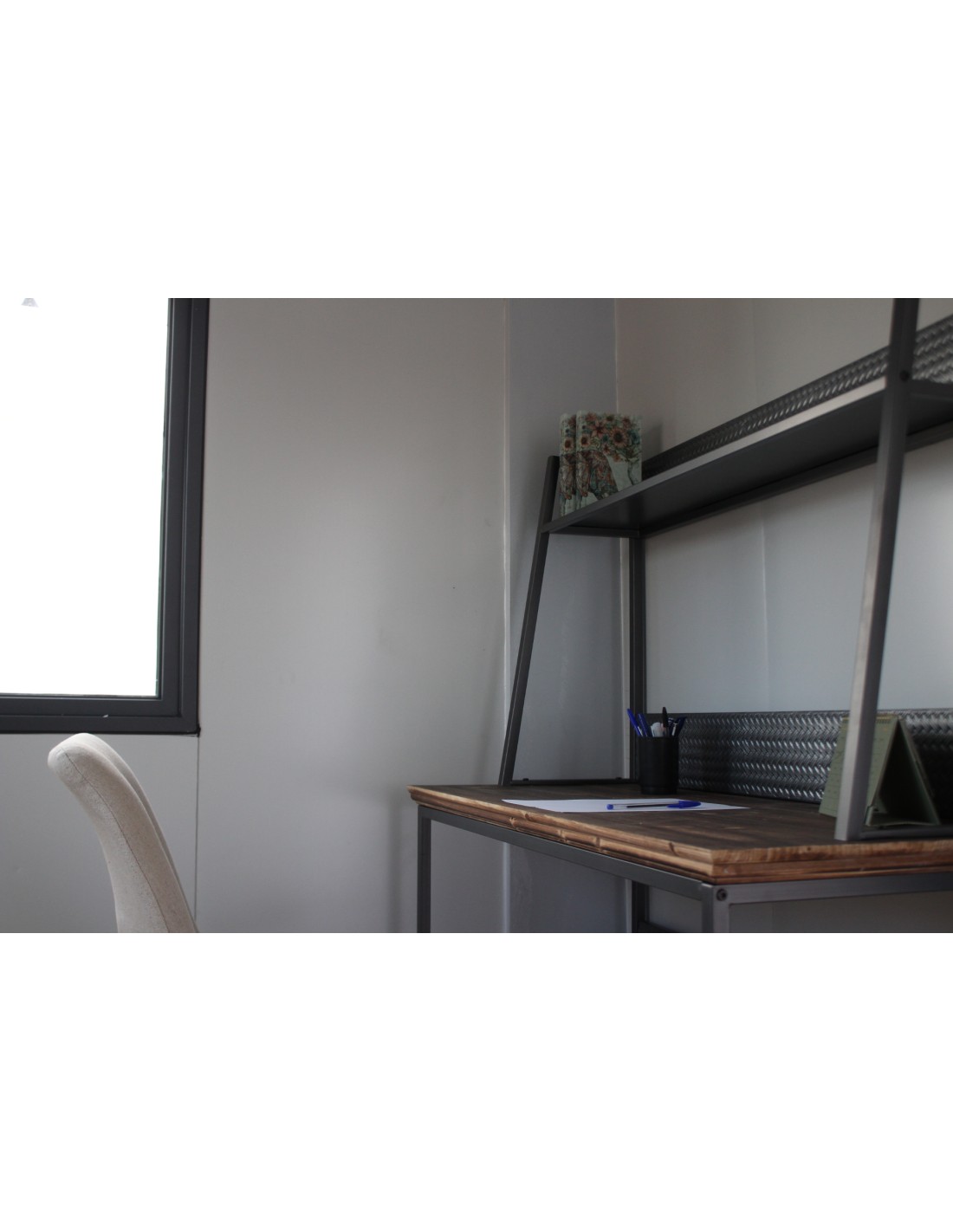 Este módulo prefabricado móvil cuenta con un diseño elegante y eficiente. Sus dimensiones incluyen dos habitaciones, cada una equipada con dos ventanas que garantizan una entrada de luz óptima, mientras que el baño está decorado con azulejos de imitación a mármol, lo que le otorga un toque sofisticado y moderno. El acabado exterior en madera tipo bungalow y las ventanas en gris le dan un aspecto atractivo y acogedor.