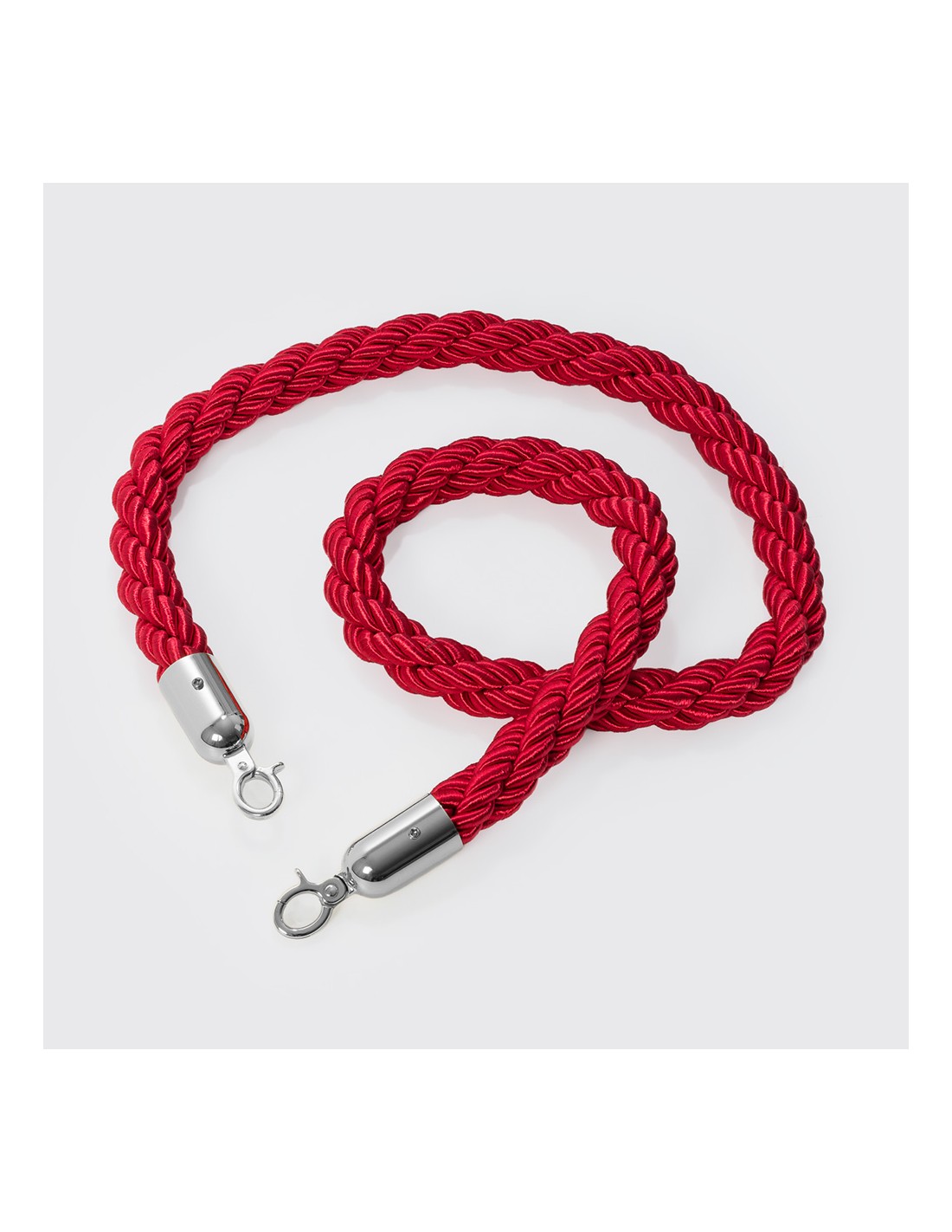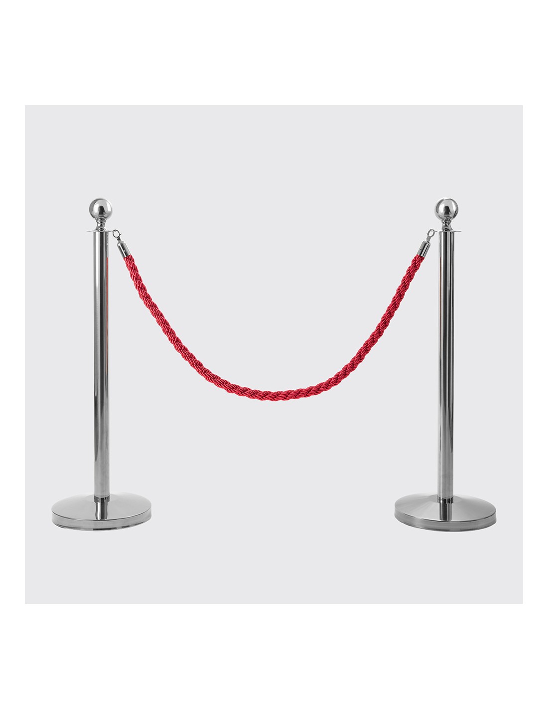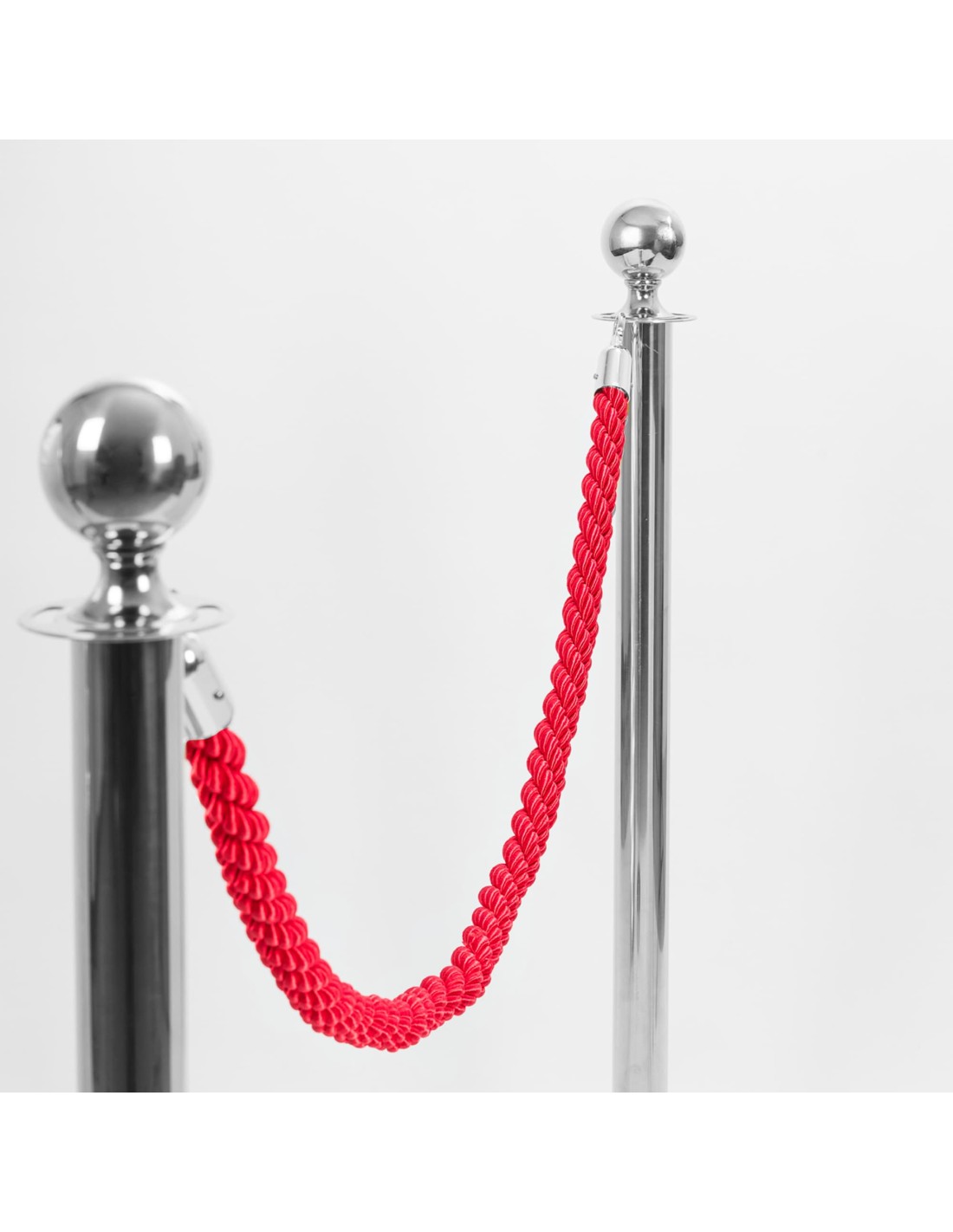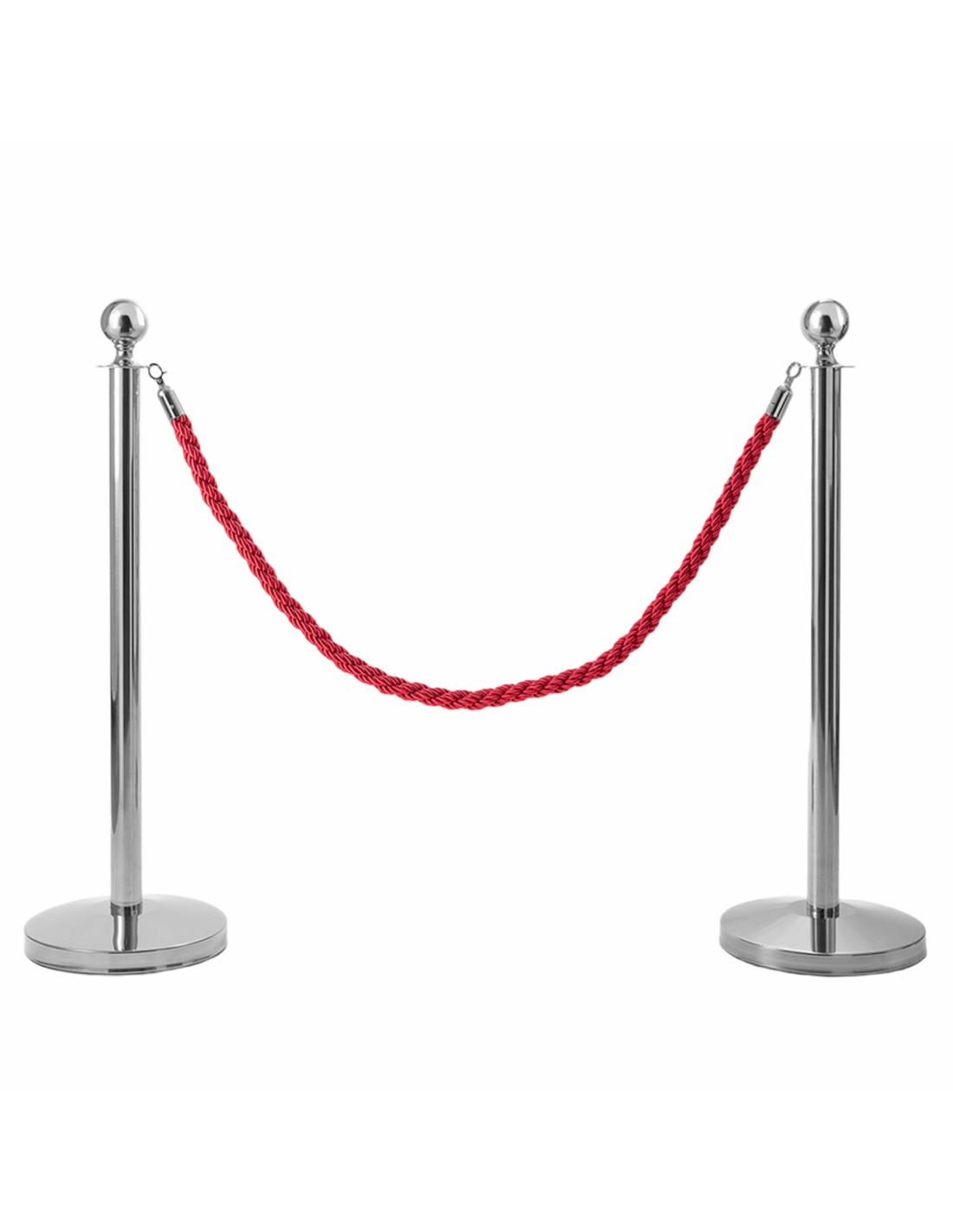 Pack de 2 mástiles de catenaria plateados y cordón rojo trenzado que forman un kit de separación perfecto para organizar clientes, entradas a zonas vip, para museos o para mantener la distancia de seguridad en establecimientos, tiendas, oficinas o lugares públicos.