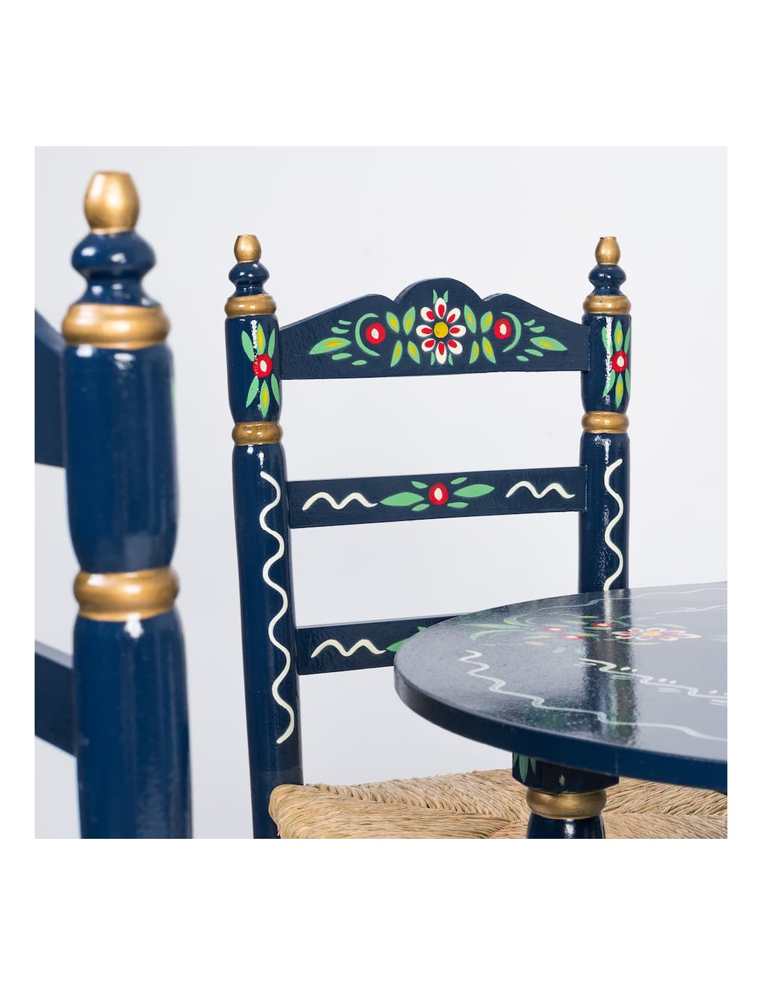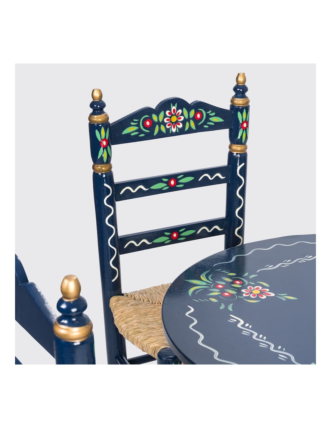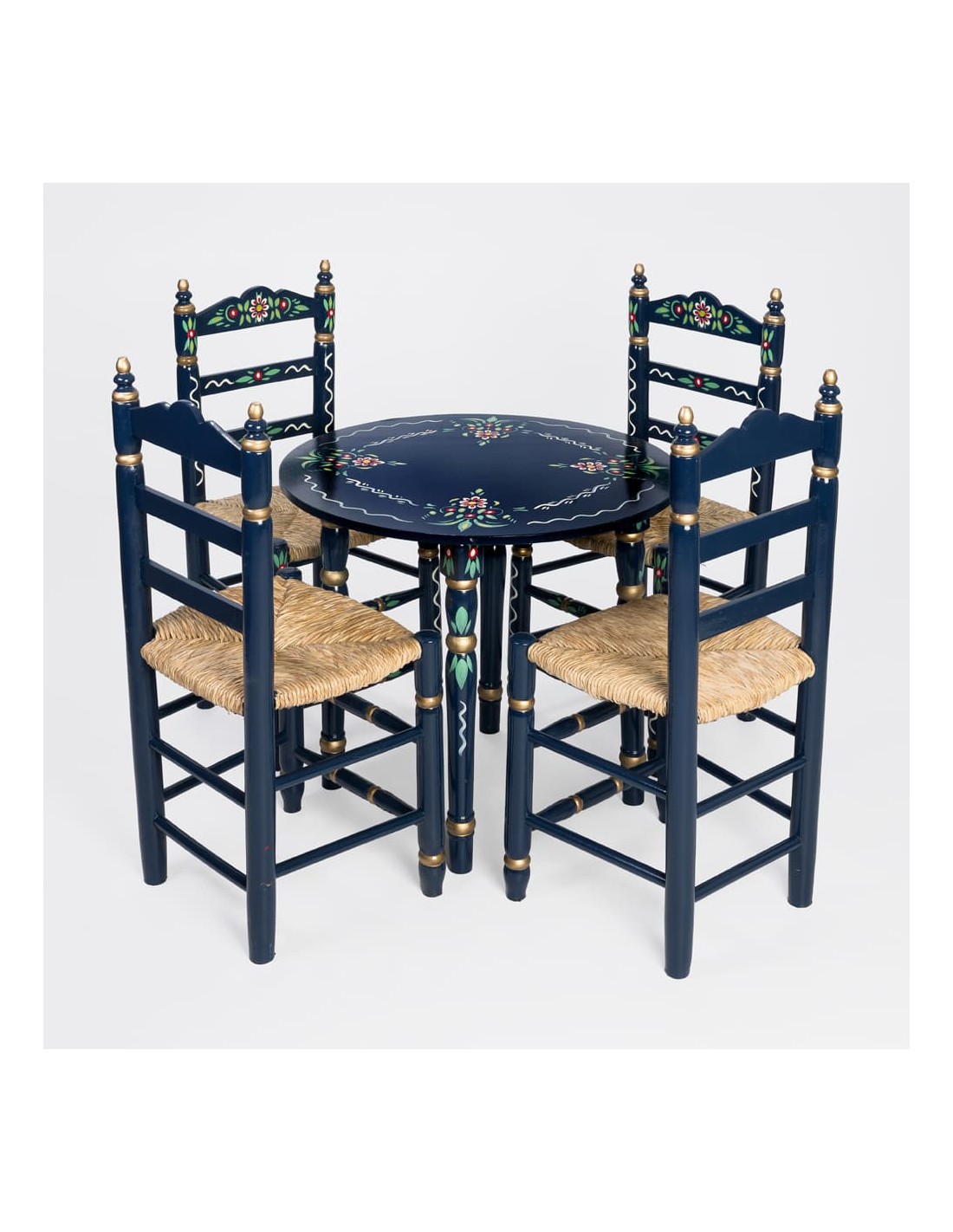 El Pack de Mesa y cuatro Sillas Sevillanas Azul es perfecto para quienes desean dar un toque flamenco a sus eventos. Este conjunto, con su diseño clásico y artesanal, captura la esencia del estilo andaluz y es ideal para ferias, fiestas flamencas, bodas con aires flamencos y más. Tanto la mesa como las sillas, están fabricadas utilizando métodos de ensamblaje tradicional, utilizando para su fabricación, madera de chopo ecológica de alta resistencia y durabilidad.
