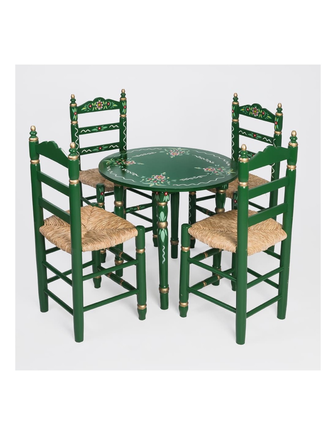 Incorpora el encanto del sur de España en tu hogar o en tus eventos con este impresionante Pack de Mesa y Cuatro Sillas Sevillanas Verdee. Este conjunto no solo resalta y define tu estilo con autenticidad, sino que también ofrece un balance óptimo entre calidad y precio, asegurando que tu inversión sea tanto estética como duradera.