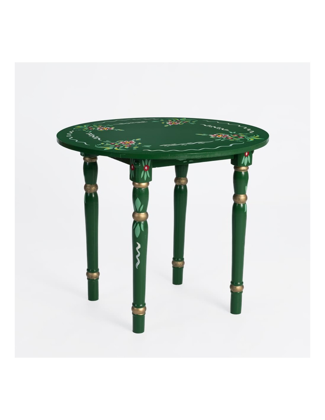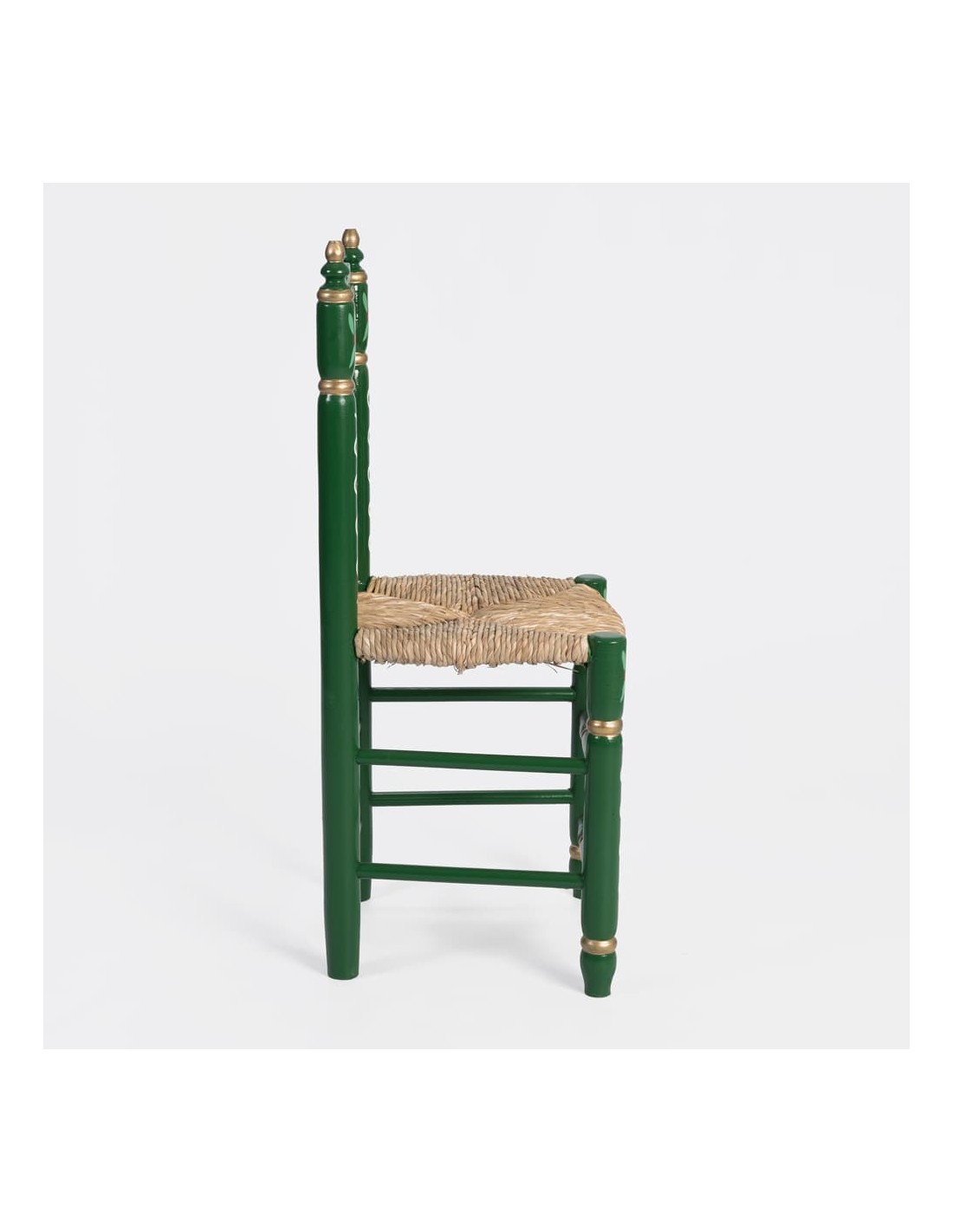 Está fabricado con madera de chopo ecológica de alta resistencia, ensamblada mediante métodos tradicionales, lo que garantiza tanto su durabilidad como su autenticidad artesanal y cada asiento tiene. Todo el conjunto, tanto la mesa como las sillas, está acabado en un vibrante color verde, añadiendo un toque fresco y elegante al ambiente.