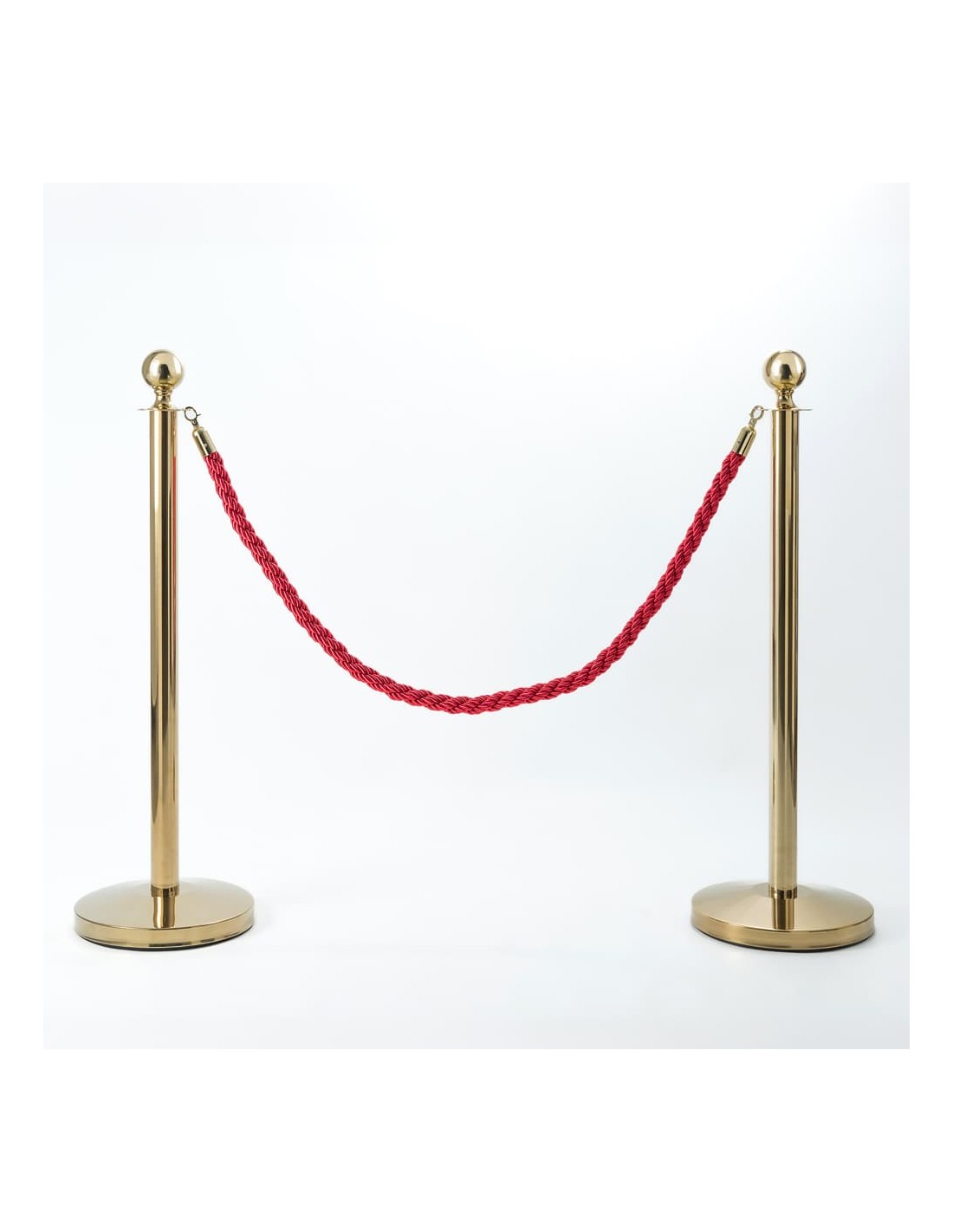 Pack de 2 mástiles de catenaria dorados y cordón rojo trenzado que forman un kit de separación perfecto para organizar clientes, entradas a zonas vip, para museos o para mantener la distancia de seguridad en establecimientos, tiendas, oficinas o lugares públicos.