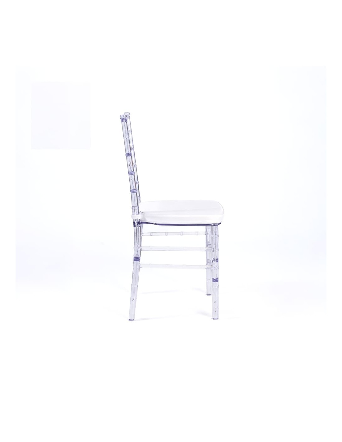 La Silla de Palillería Transparente con Cojín modelo Tiffany o Chiavari es una elección de elegancia y confort para cualquier celebración. Fabricada en resina monobloc de polipropileno transparente, esta silla es una fusión de diseño clásico y modernidad, ofreciendo una estética limpia y sofisticada que realza el ambiente de eventos como bodas, banquetes y conferencias.