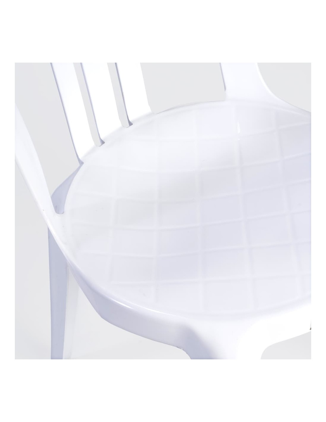 Esta silla está fabricada en polipropileno inyectado de alta resistencia, lo que proporciona durabilidad frente al uso continuado. Incorpora protección UV en el material, permitiendo su utilización tanto en interiores como en exteriores sin deterioro por exposición solar.