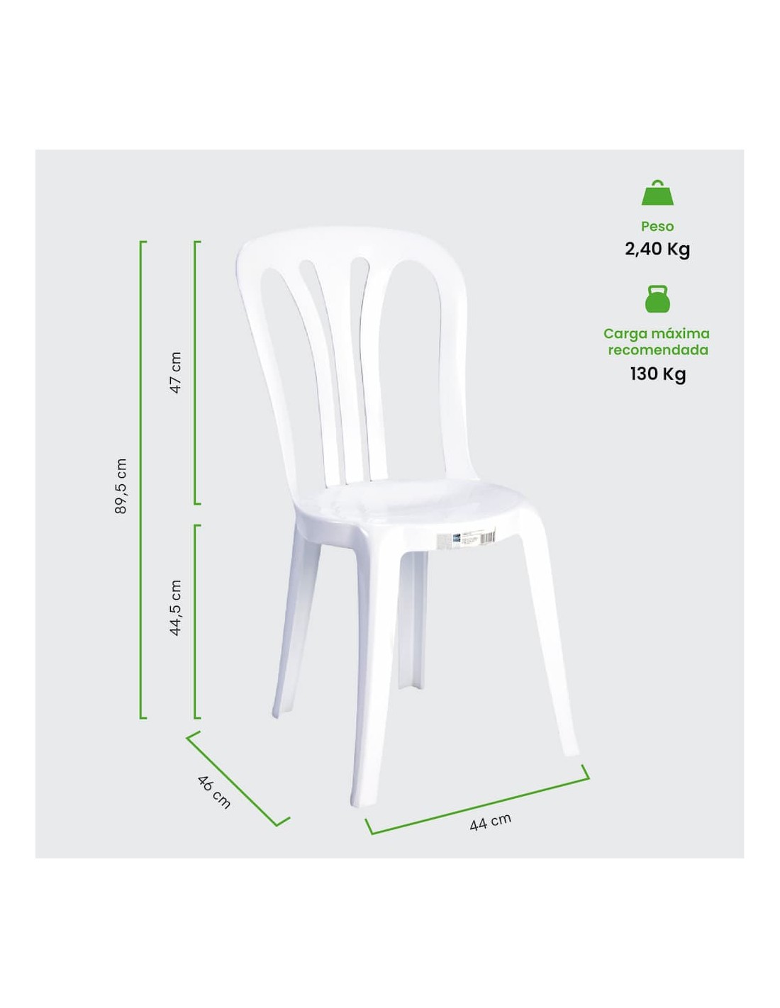 Con un peso aproximado de 2,4 kg, la silla es fácil de transportar y manipular durante el montaje y desmontaje de eventos. Además, su diseño apilable permite almacenar hasta 22 unidades, optimizando el espacio en almacenes y vehículos de transporte.