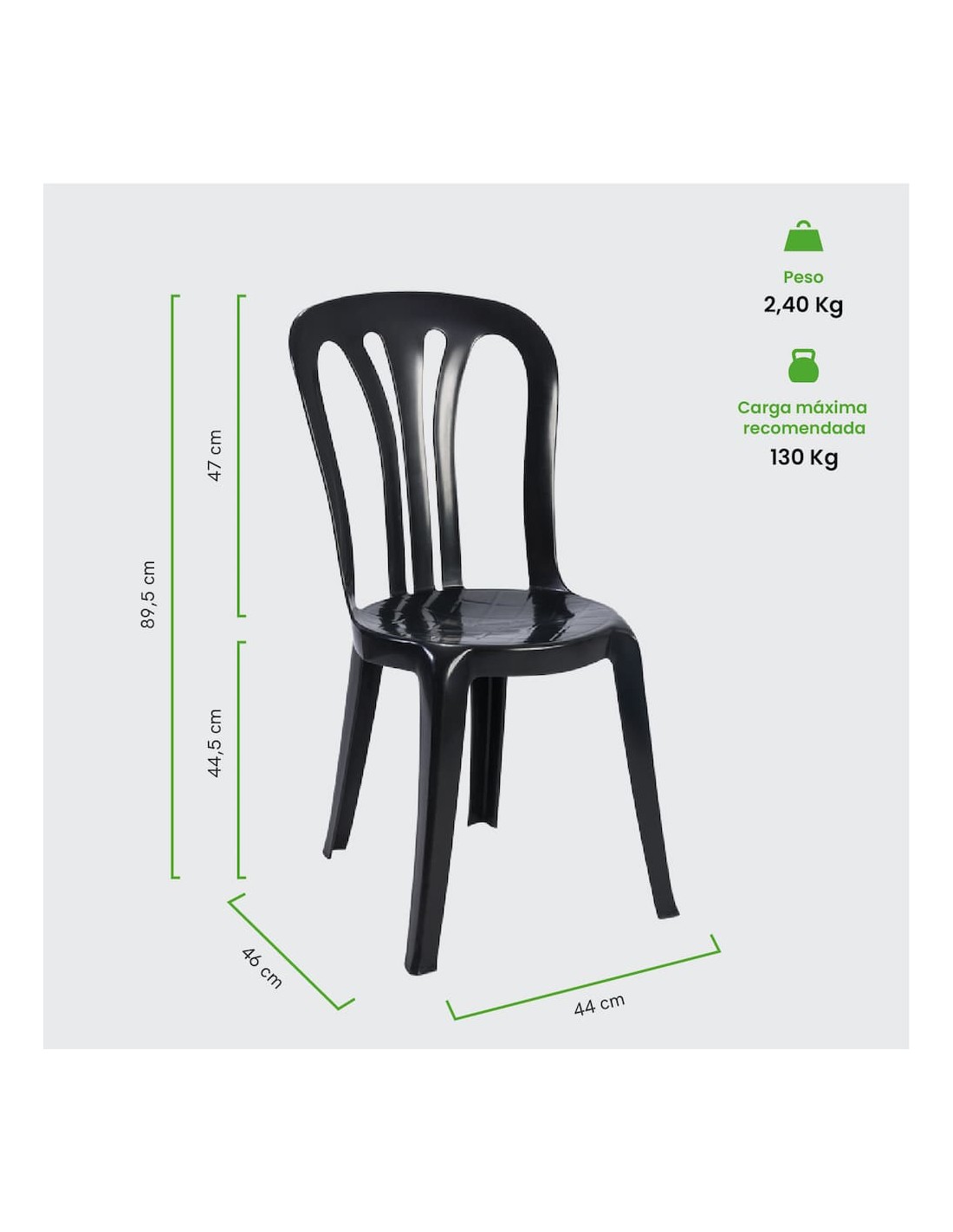 Con un peso aproximado de 2,4 kg, la silla es fácil de transportar y manipular durante el montaje y desmontaje de eventos. Además, su diseño apilable permite almacenar hasta 22 unidades, optimizando el espacio en almacenes y vehículos de transporte.