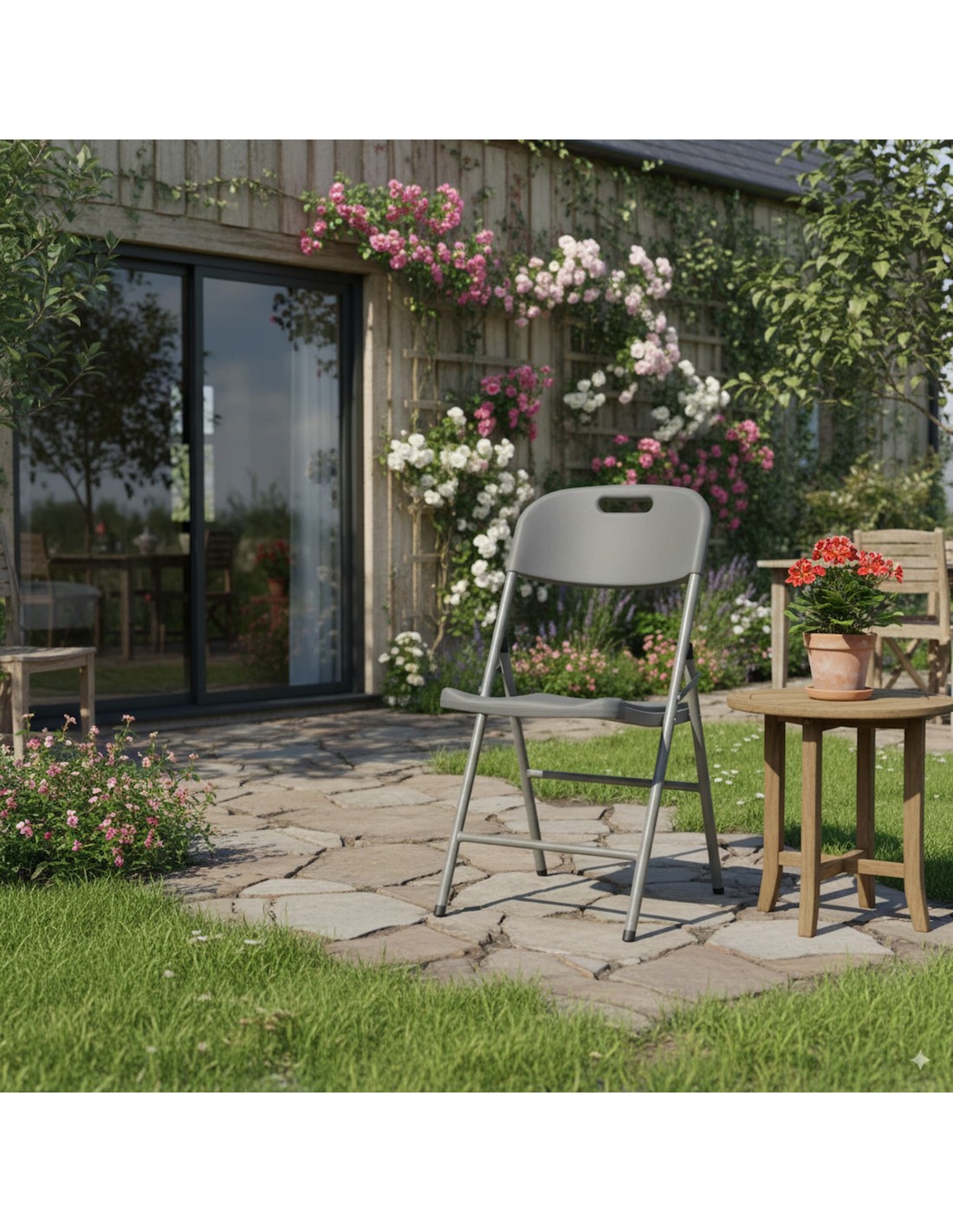 Si necesitas más sillas para acomodar a los invitados de tu evento, o simplemente quieres proporcionar una solución de asiento al aire libre, la silla plegable de plástico gris es la opción perfecta para incrementar el número de asientos disponibles. Esta silla ofrece una comodidad inigualable y versátil, siendo ideal tanto para la cocina como para un patio exterior.