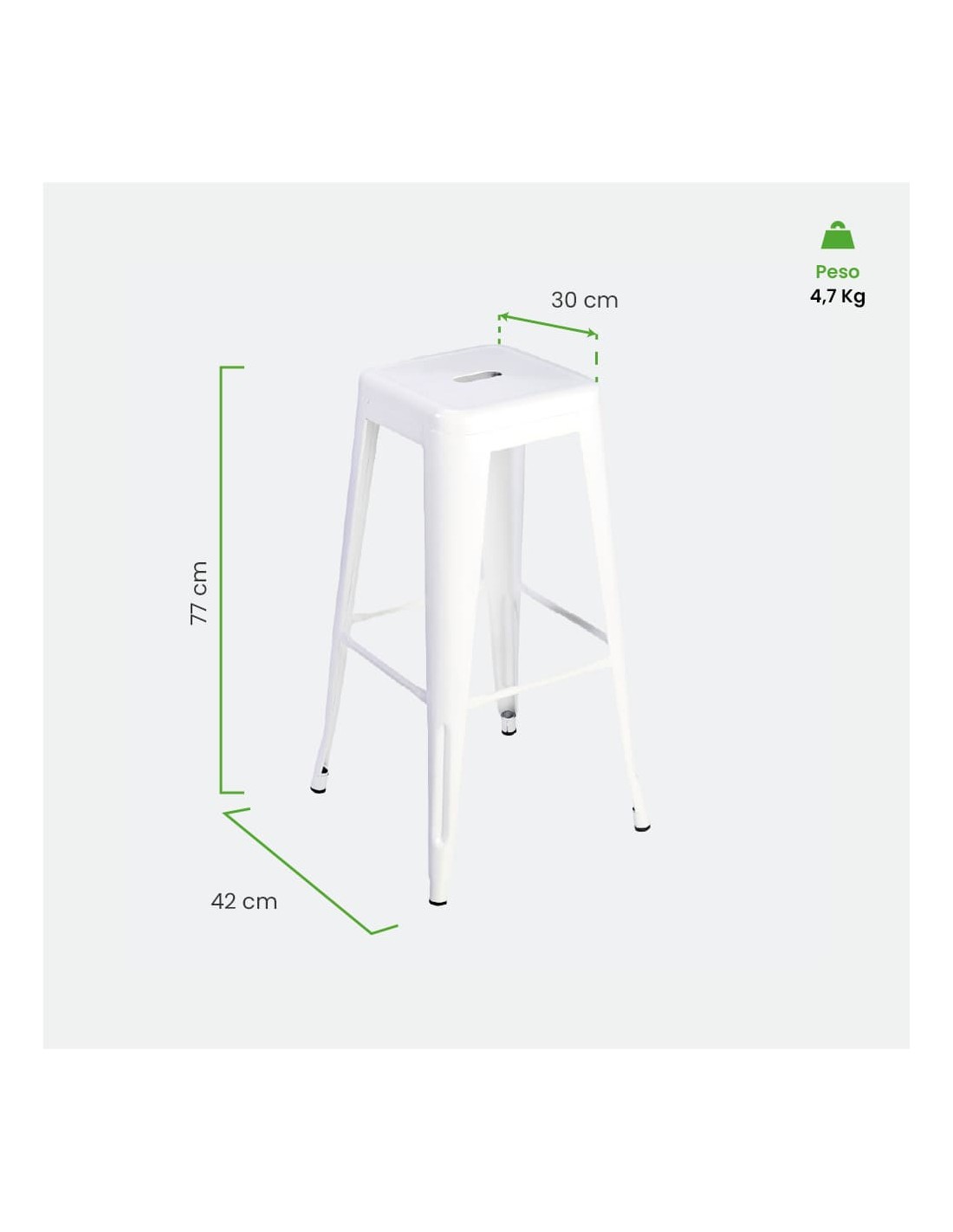 Con una altura total de 77 cm y un asiento cuadrado de 30 × 30 cm, este taburete proporciona una solución práctica como asiento auxiliar para bares, cafeterías, eventos, ferias o espacios comerciales. Su base de 42 cm garantiza estabilidad y seguridad durante el uso.