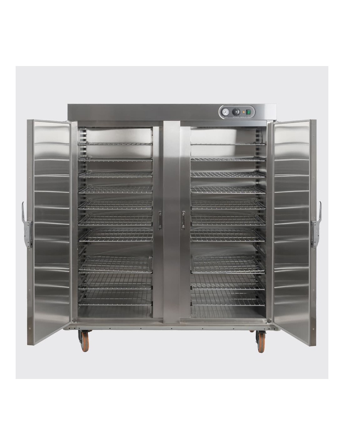 ✔️ Inclui: Convecção de ar quente por meio de turbina, caixa de umidificação por água, 22 prateleiras ajustáveis no total (11 de cada lado).