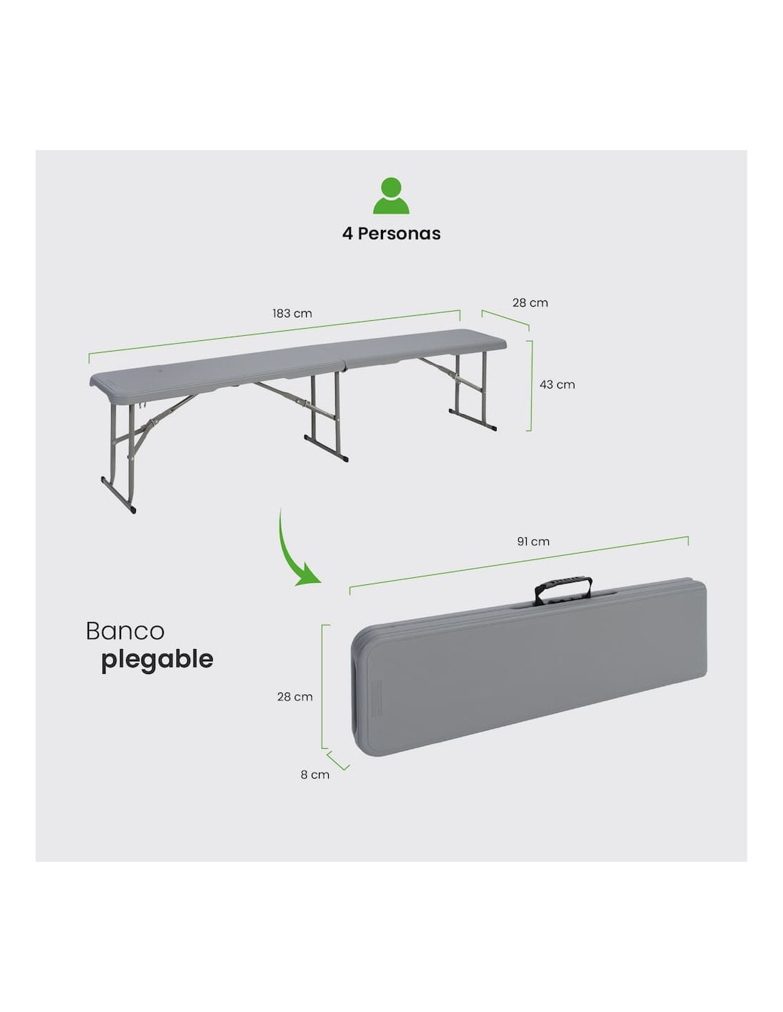 Com 183 cm de comprimento, 43 cm de altura e 28 cm de largura, este banco pode acomodar confortavelmente até quatro pessoas. O seu peso leve de 7 kg facilita o transporte e a movimentação.
