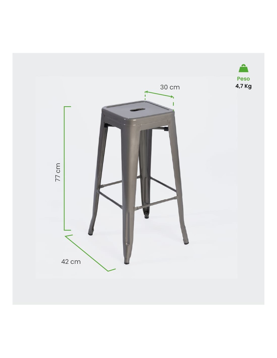 Com uma altura total de 77 cm, base de 42 cm e assento quadrado de 30 × 30 cm, este banco é uma solução prática como assento auxiliar em bares, cafés, eventos, feiras ou espaços comerciais. A estrutura de quatro patas garante elevada estabilidade.