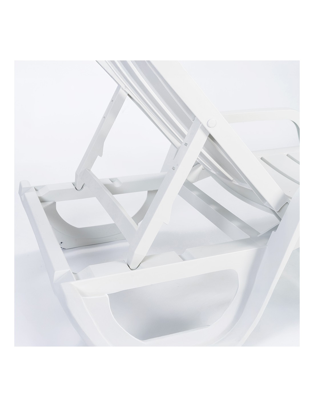É fabricada em polipropileno branco de alta densidade, garantindo sua resistência e durabilidade em condições de uso ao ar livre. Com um peso de 8,60 kg e uma capacidade de carga de até 120 kg, esta espreguiçadeira é a escolha perfeita para qualquer tipo de evento.
