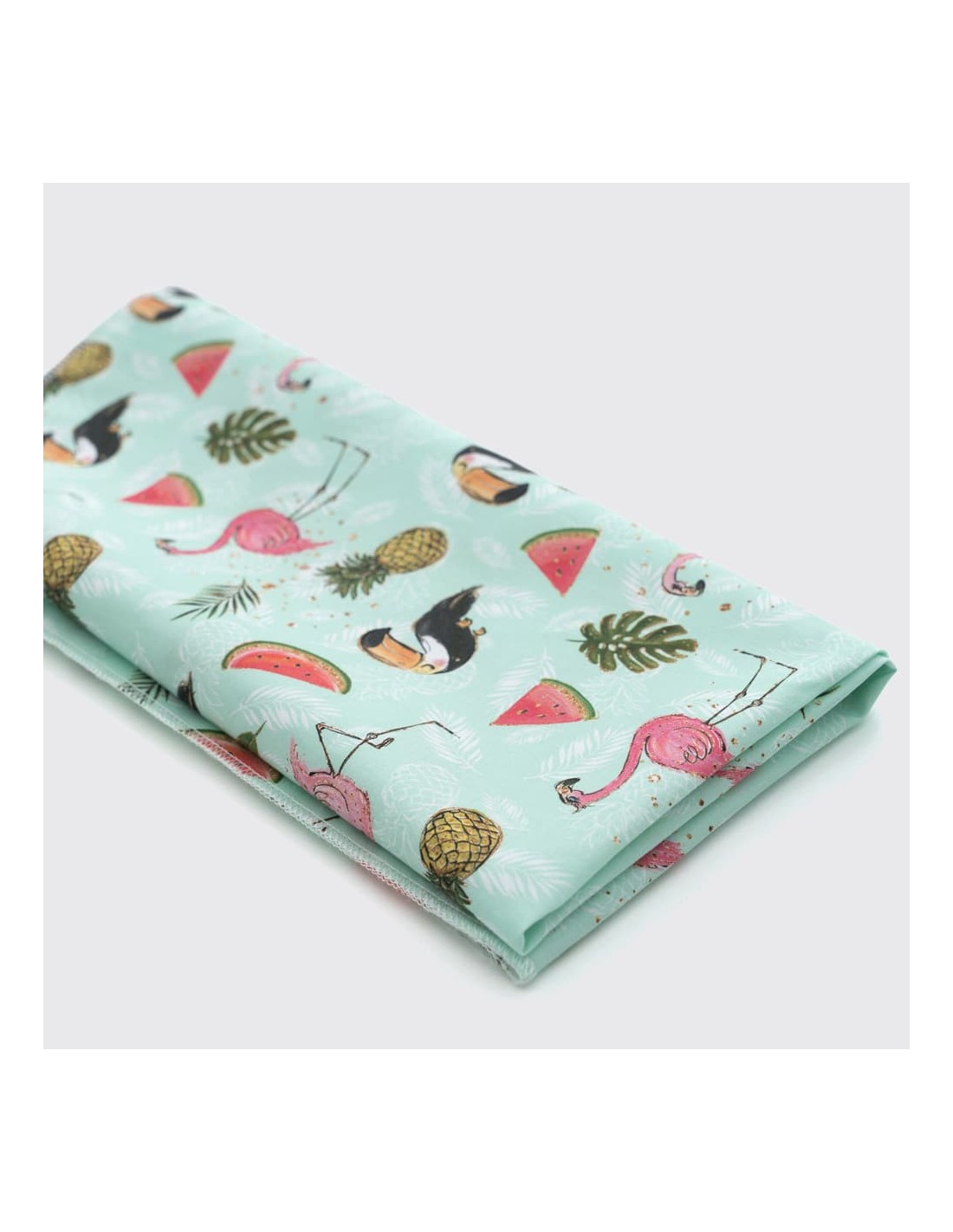 ✔ Design tropical: Flamingos cor-de-rosa, abacaxis e melancias em fundo verde menta.