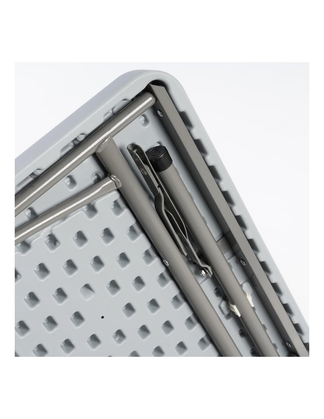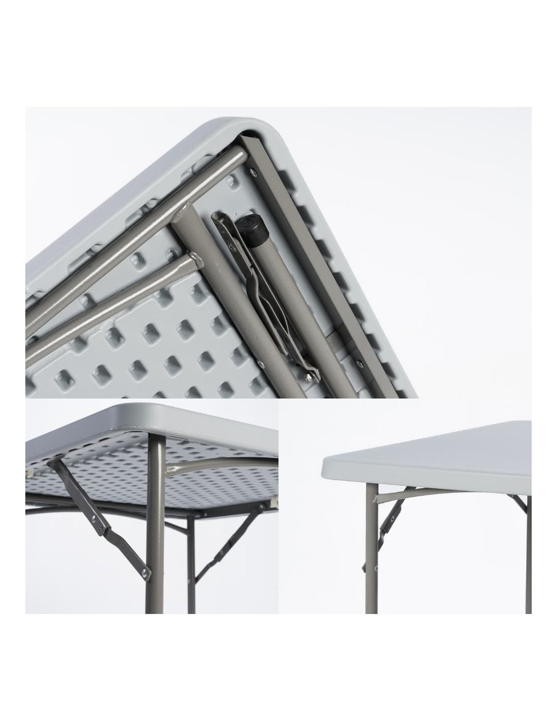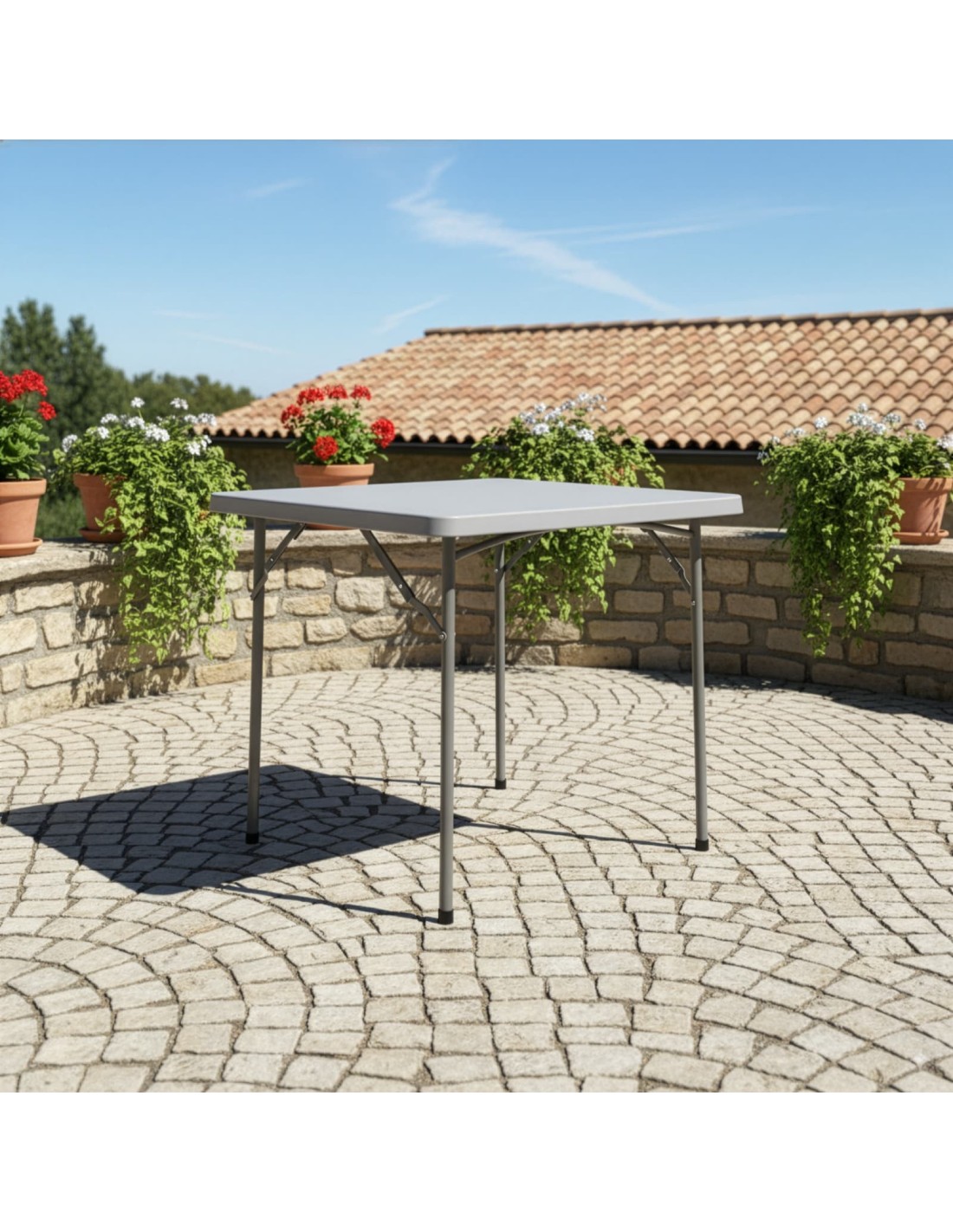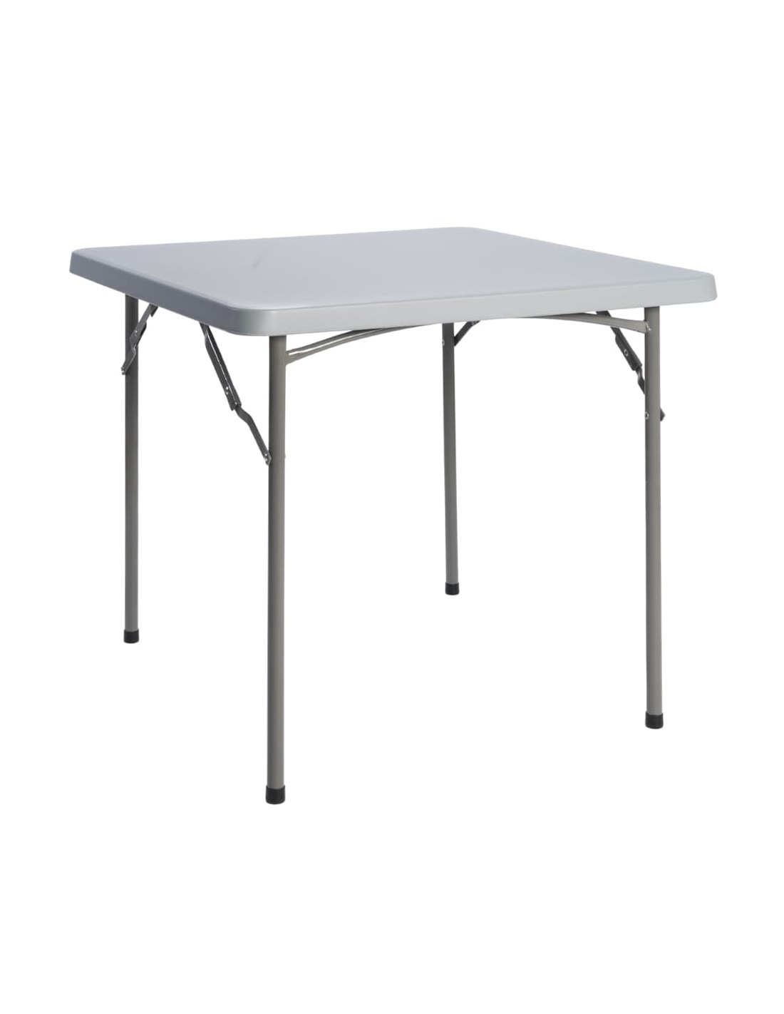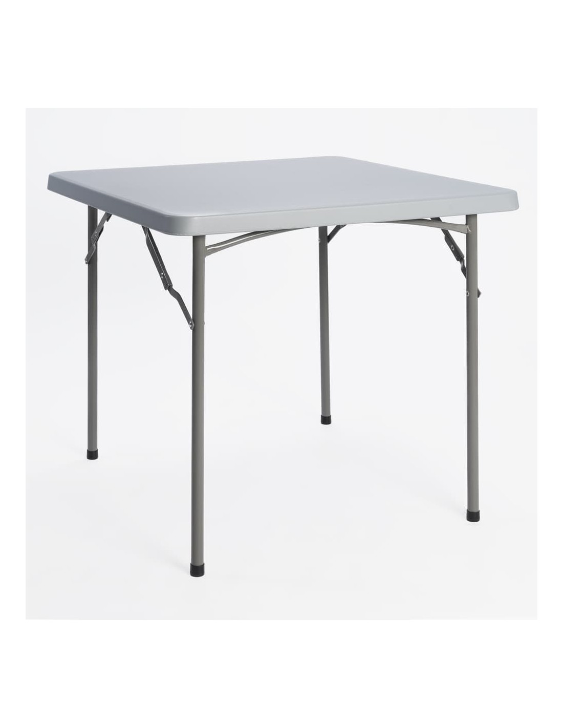 Mesa quadrada com tampo fixo e pernas dobráveis, 100% reciclável e com capacidade para 4 pessoas.