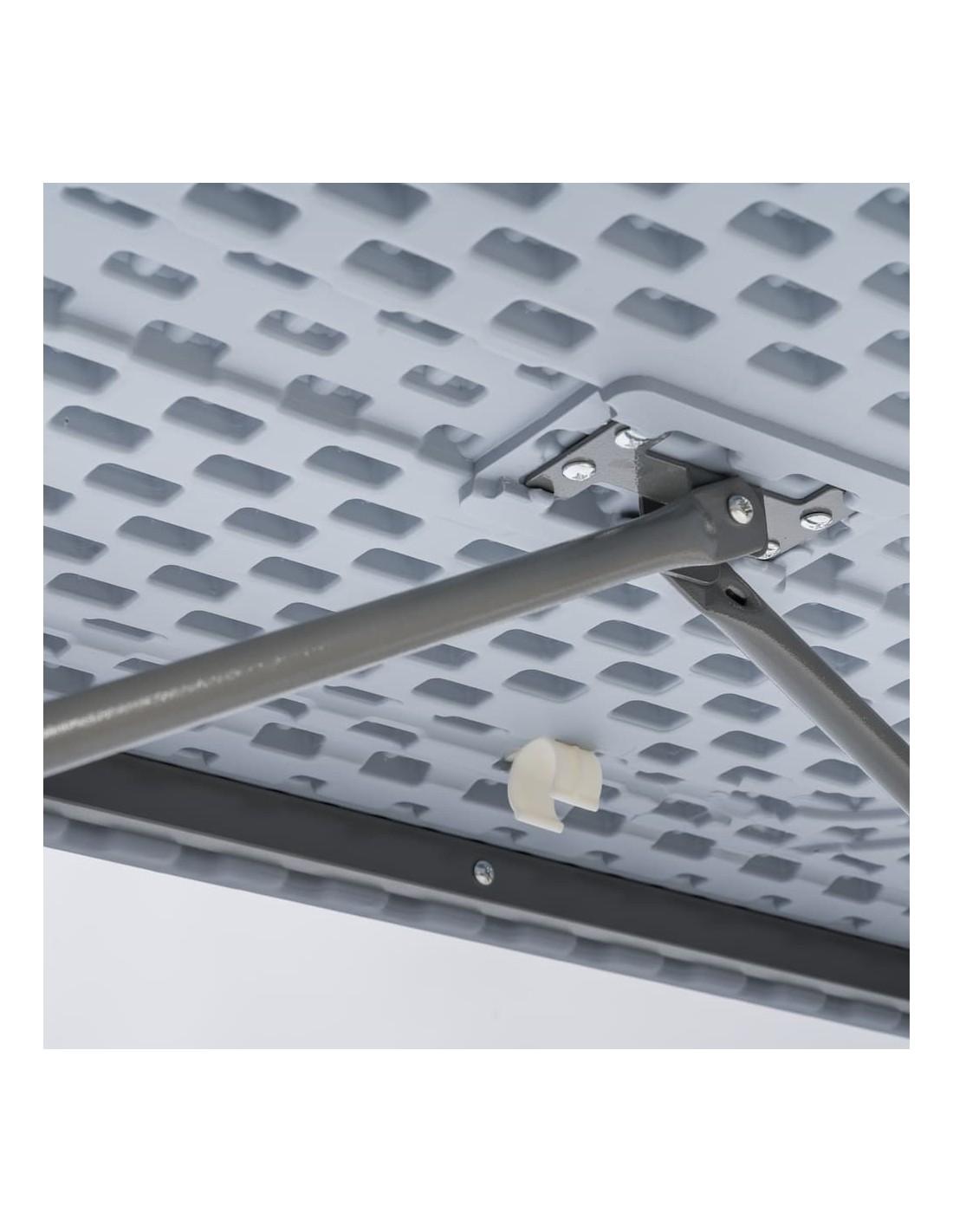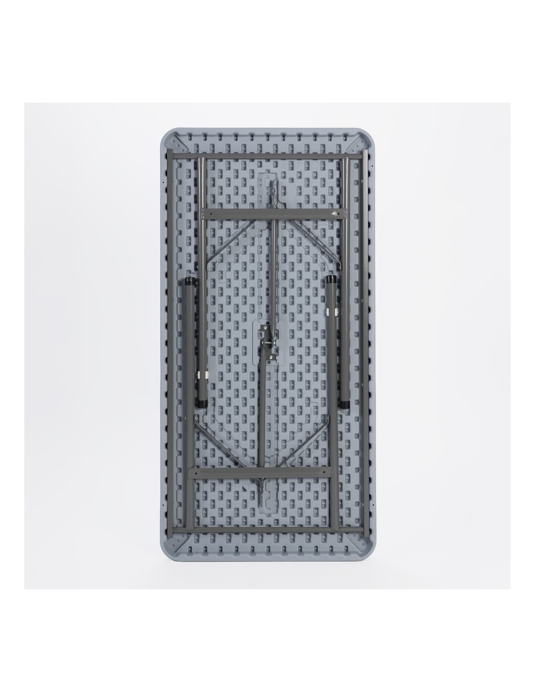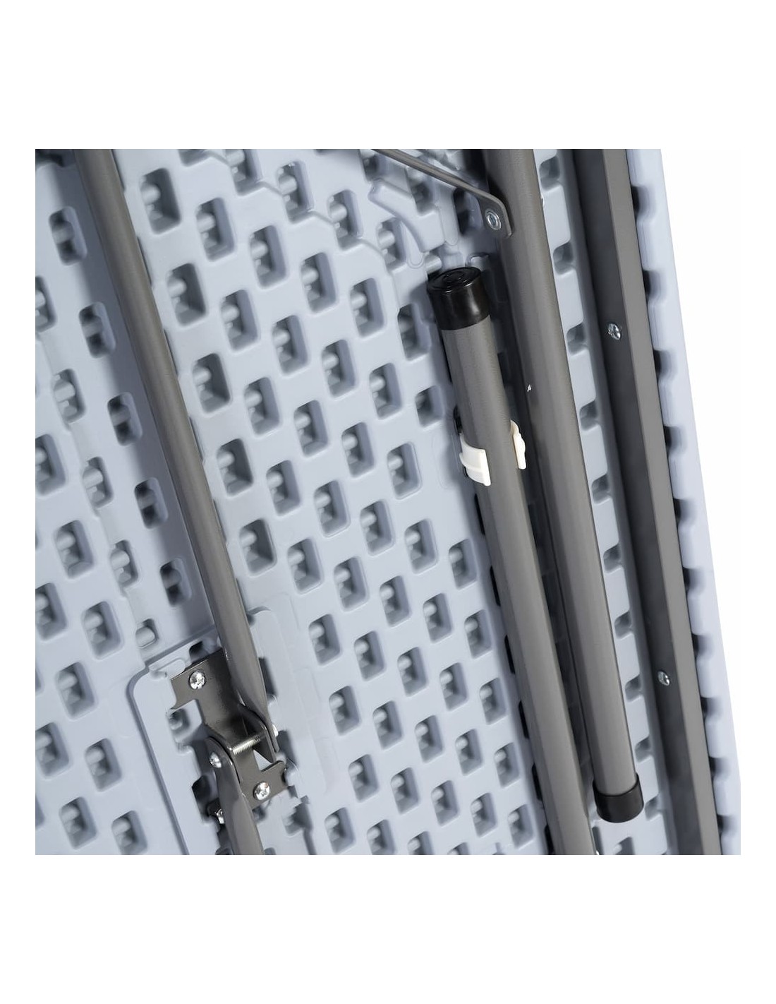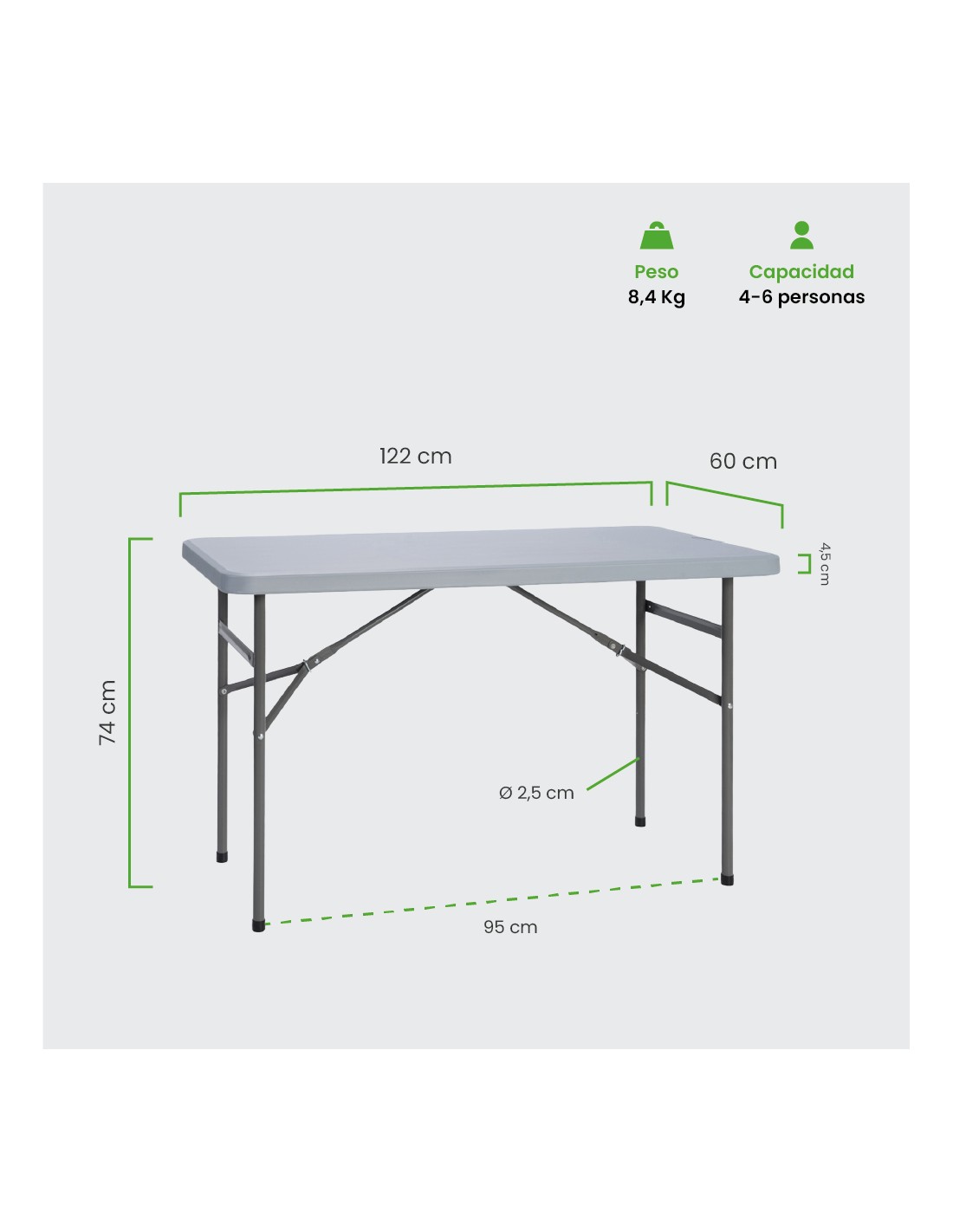 ✔ Estrutura resistente e funcional: Tampo em polietileno de alta densidade (HDPE) com pernas metálicas dobráveis para facilitar transporte e arrumação.