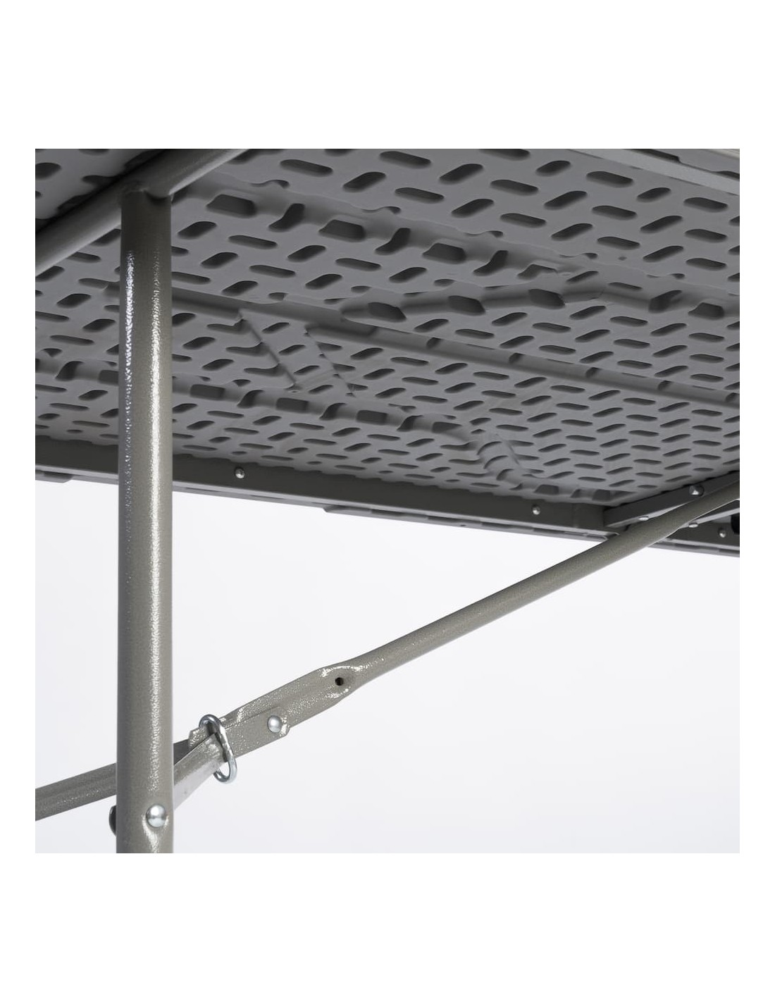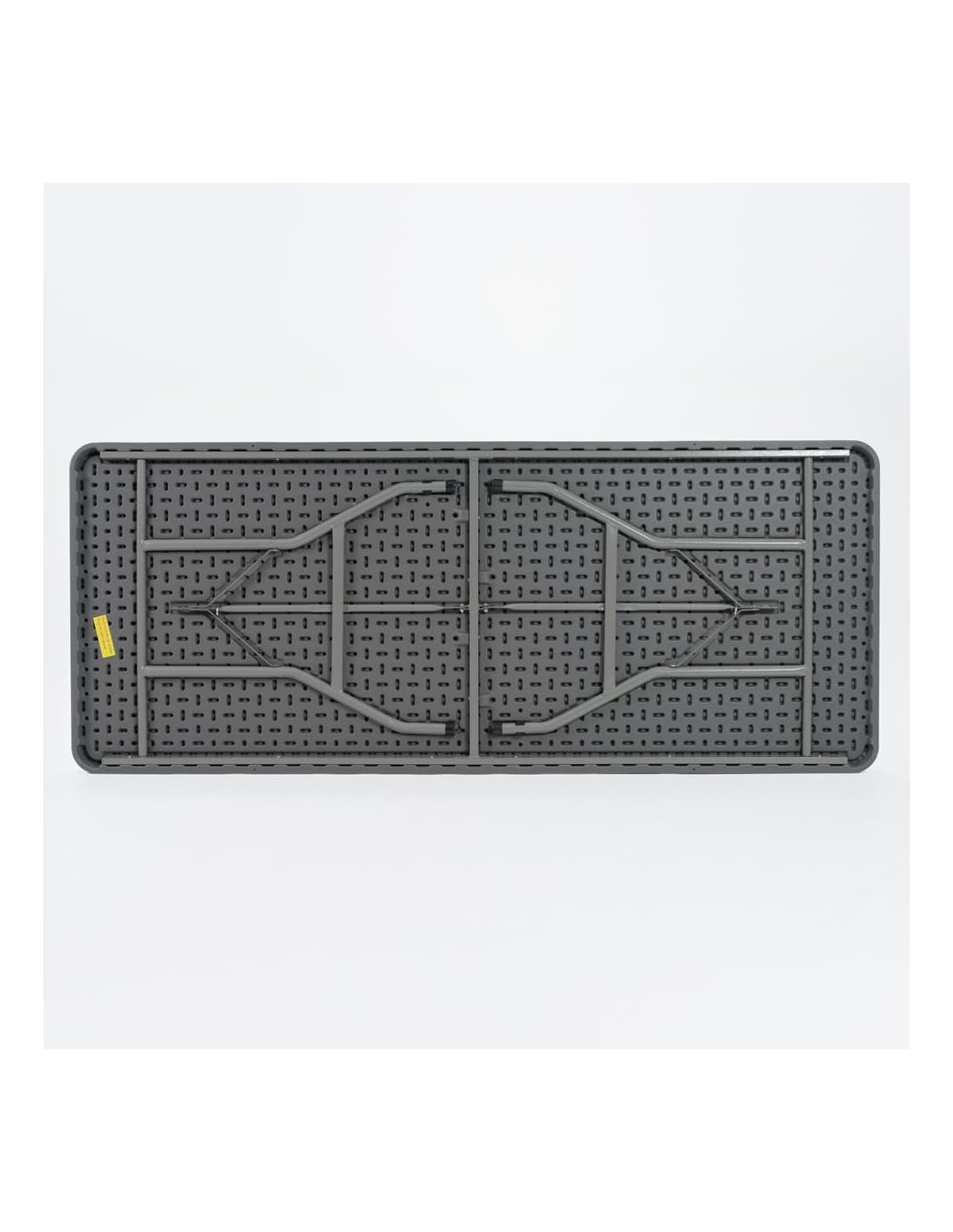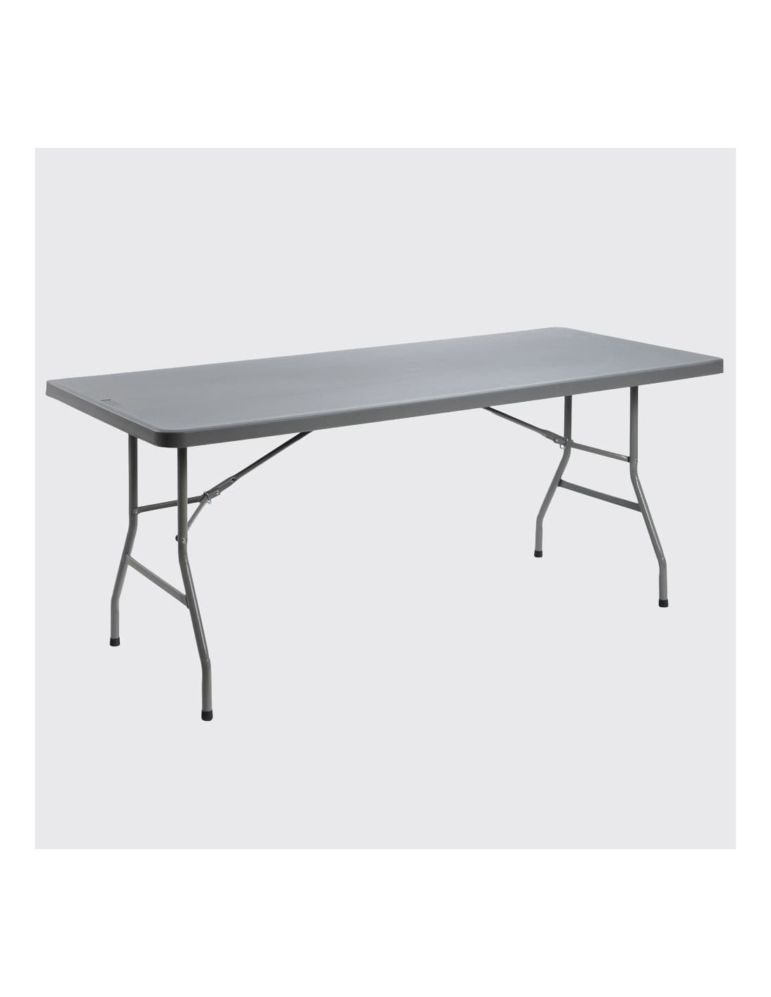 Este modelo é fabricado em polietileno cinza de alta densidade e conta com um sistema de dobragem das pernas que facilita o armazenamento e transporte, com borrachas antiderrapantes.