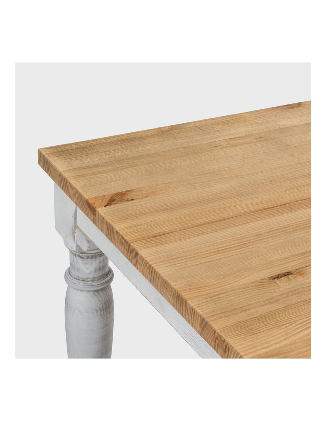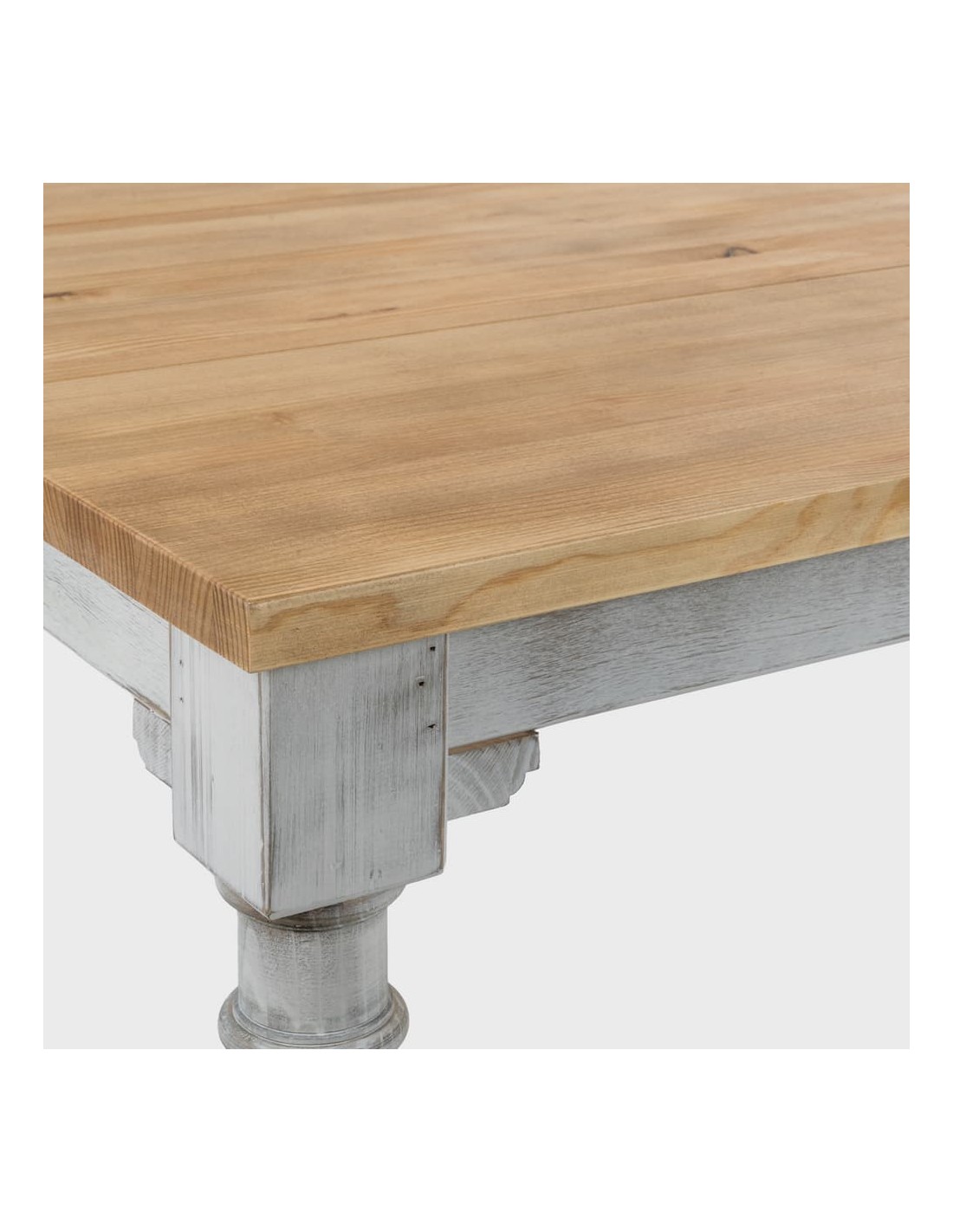 A estrutura da mesa conta com 4 pernas removíveis de madeira de pinho na cor branco desgastado, também personalizáveis, com um diâmetro de 9 cm cada. Este design combina robustez com elegância, sendo ideal para uma ampla variedade de ambientes.