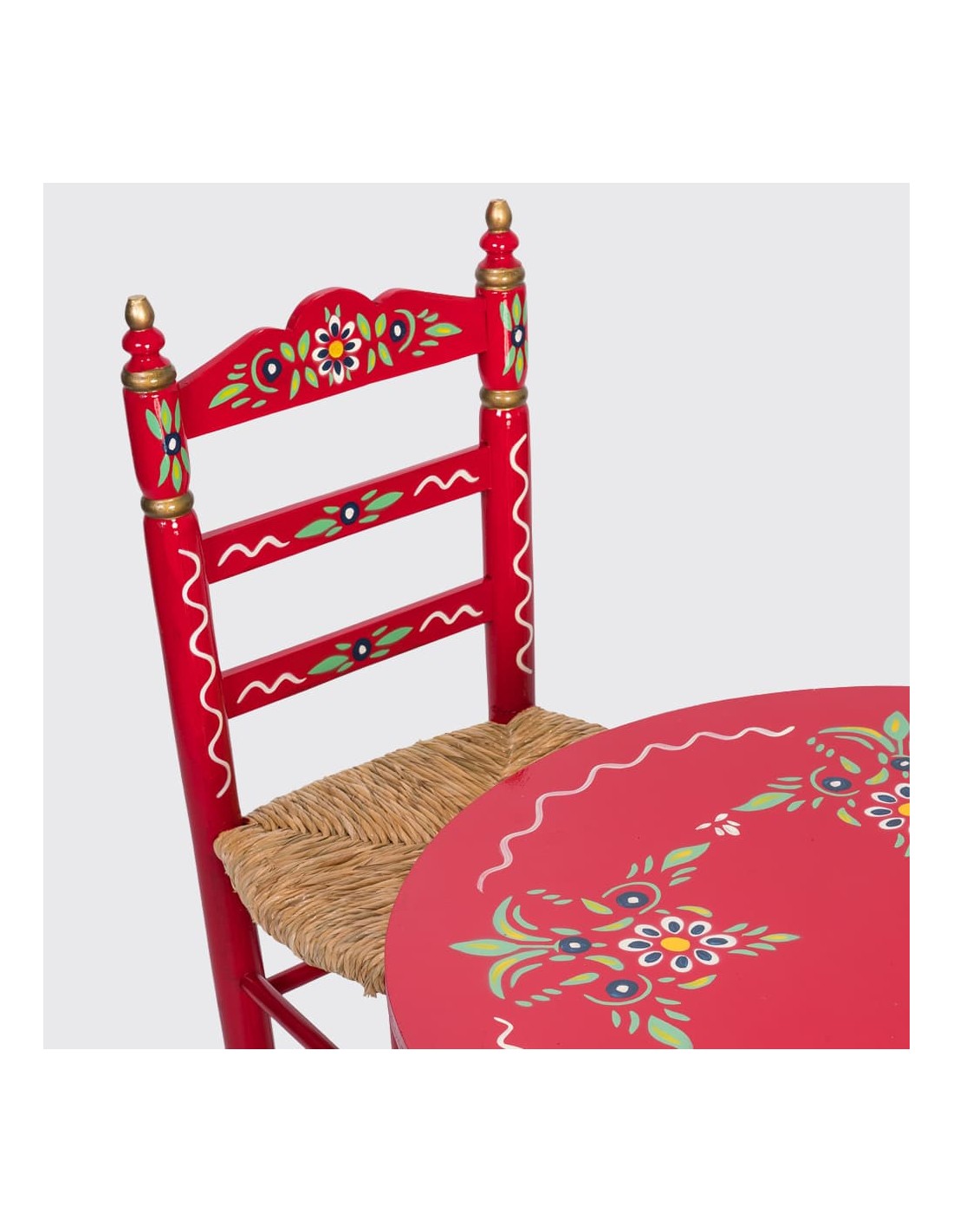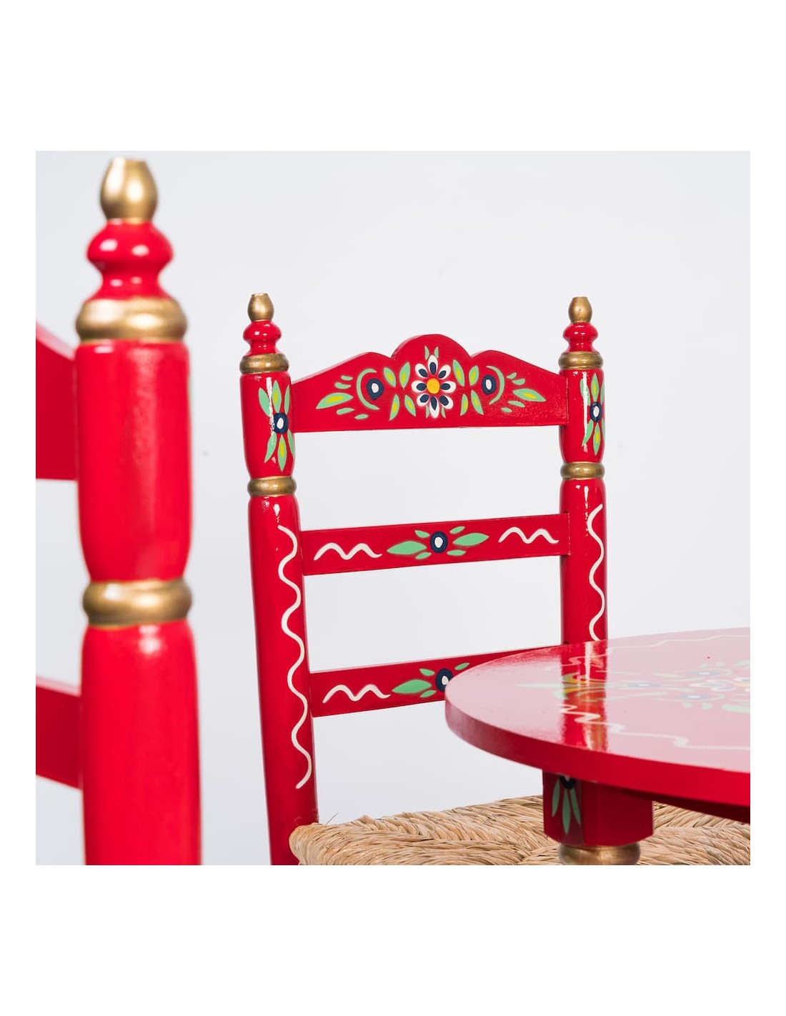 O Conjunto de Mesa e quatro Cadeiras Sevillanas Vermelhas é perfeito para quem deseja dar um toque flamenco aos seus eventos. Este conjunto, com seu design clássico e artesanal, captura a essência do estilo andaluz e é ideal para feiras, festas flamencas, casamentos com temas flamencos e muito mais. Tanto a mesa quanto as cadeiras são fabricadas utilizando métodos de montagem tradicionais, usando madeira de álamo ecológica de alta resistência e durabilidade.