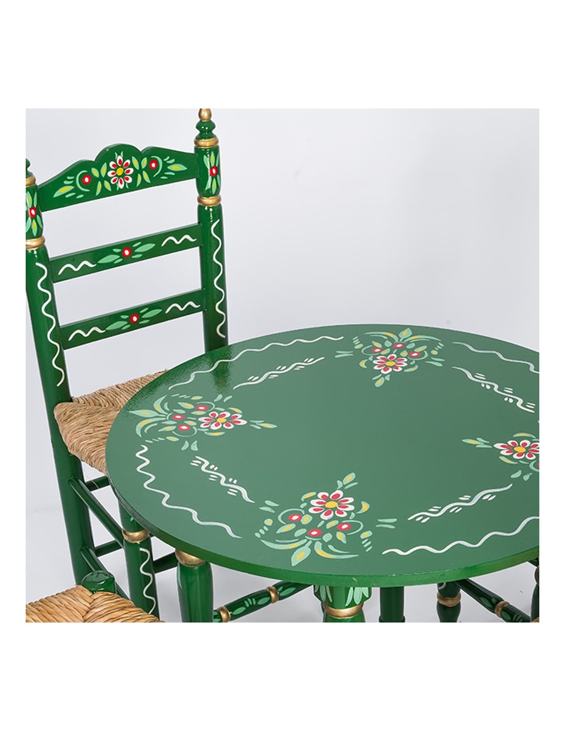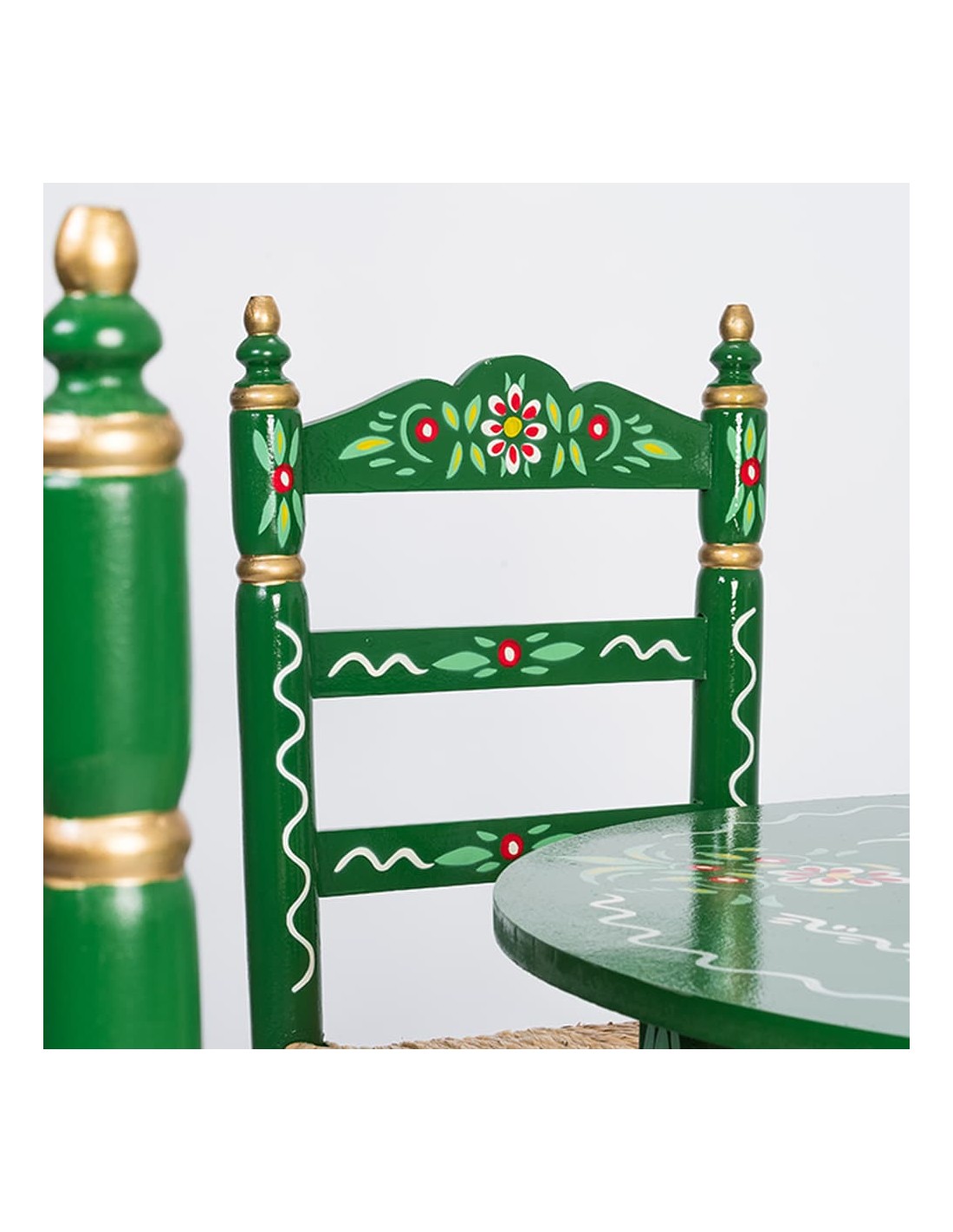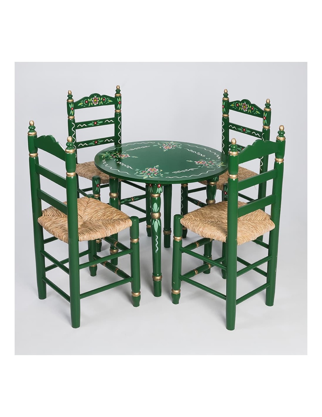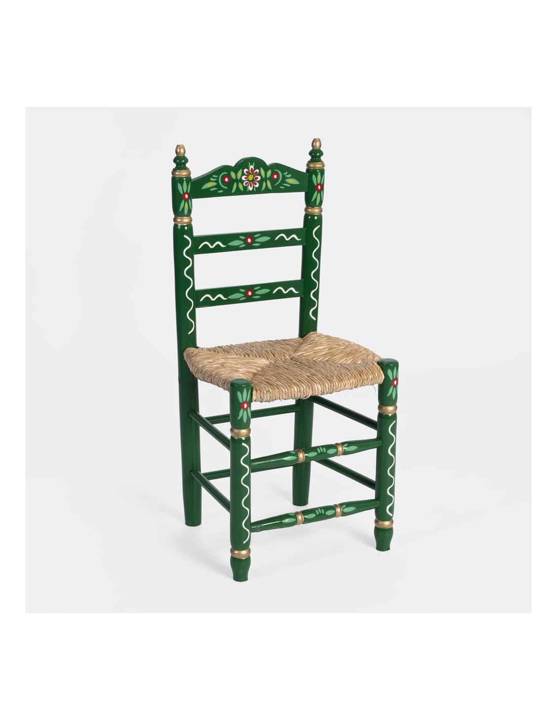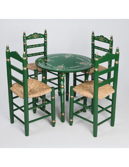 O Pack de Mesa e Quatro Cadeiras Sevillanas Verde é perfeito para quem deseja dar um toque flamenco aos seus eventos. Este conjunto, com seu design clássico e artesanal, captura a essência do estilo andaluz e é ideal para feiras, festas flamencas, casamentos com estilo flamenco e muito mais. Tanto a mesa quanto as cadeiras são fabricadas utilizando métodos de montagem tradicional, empregando madeira de álamo ecológica de alta resistência e durabilidade.