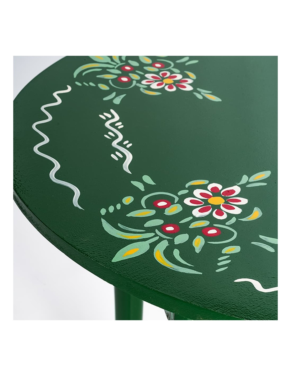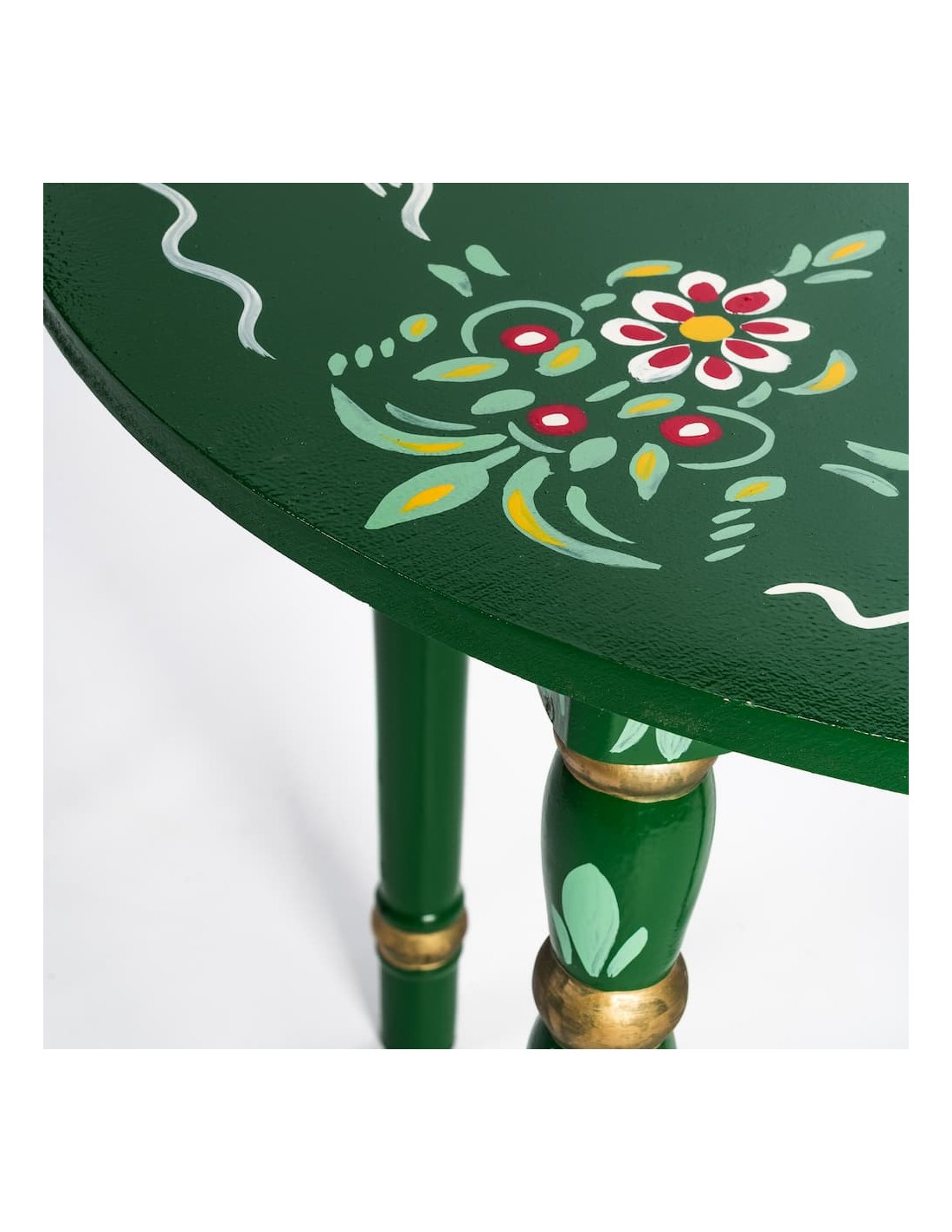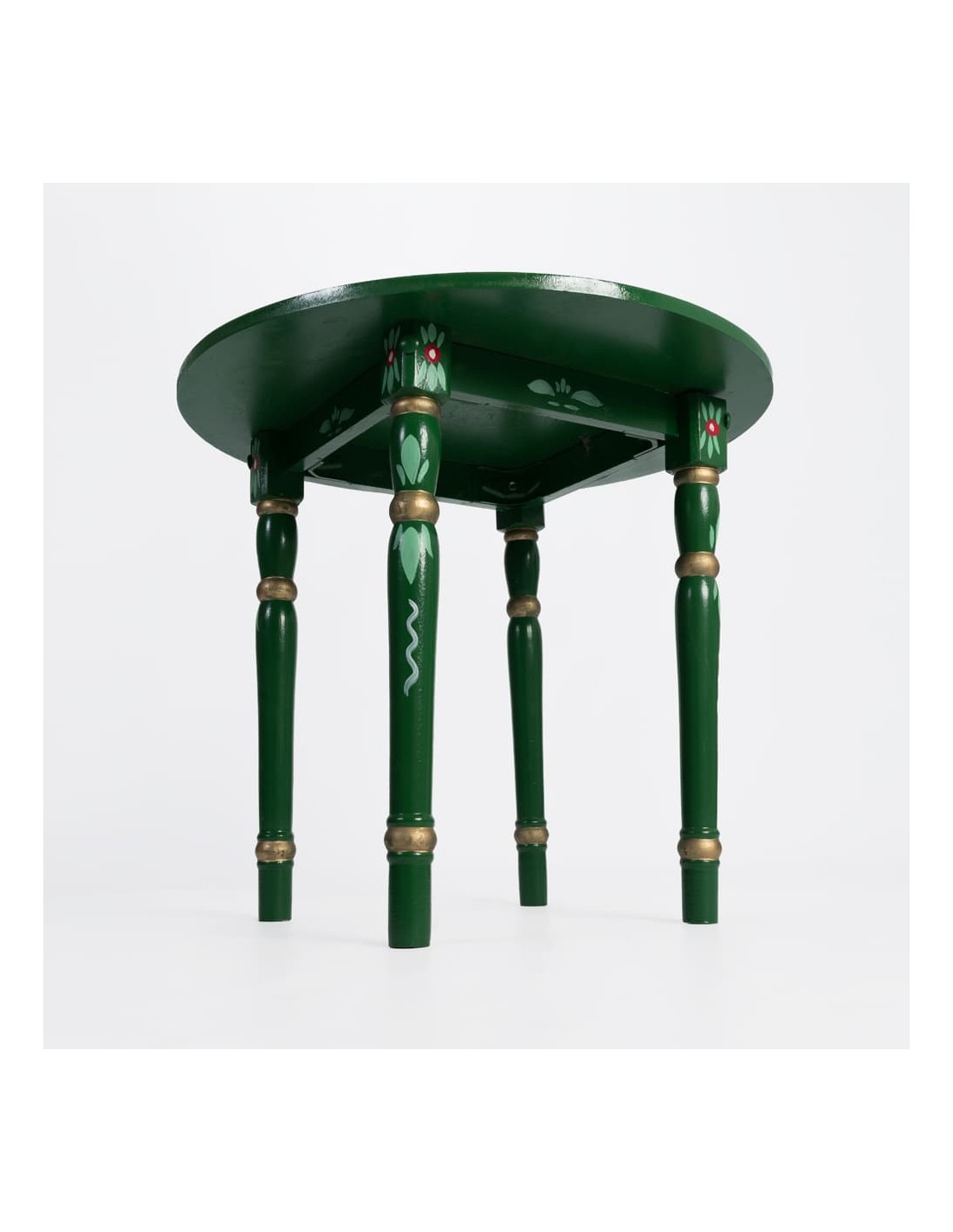 É fabricado com madeira de álamo ecológica de alta resistência, montada com métodos tradicionais, o que garante tanto sua durabilidade quanto sua autenticidade artesanal. Todo o conjunto, tanto a mesa quanto as cadeiras, está acabado em um vibrante cor verde, adicionando um toque fresco e elegante ao ambiente.