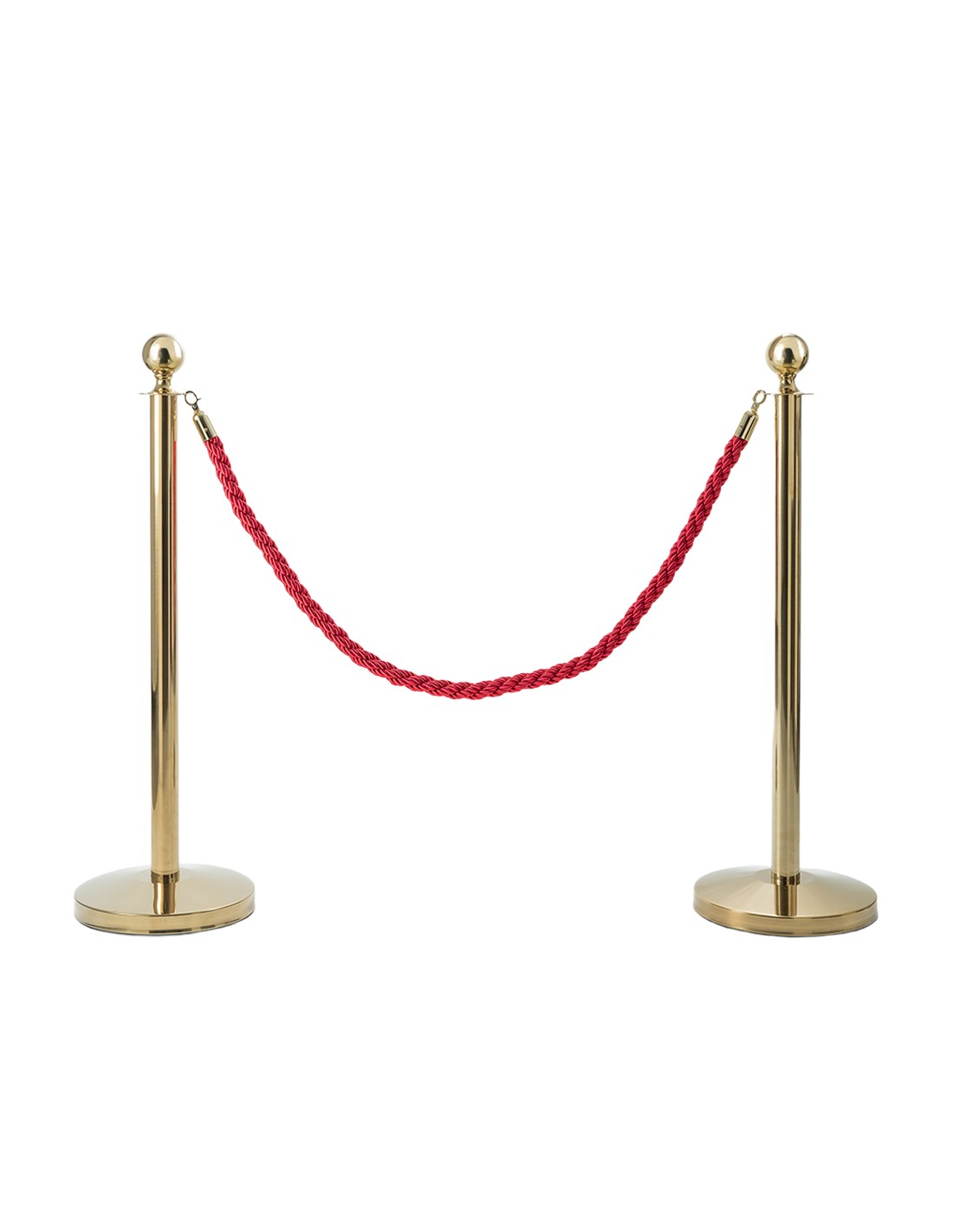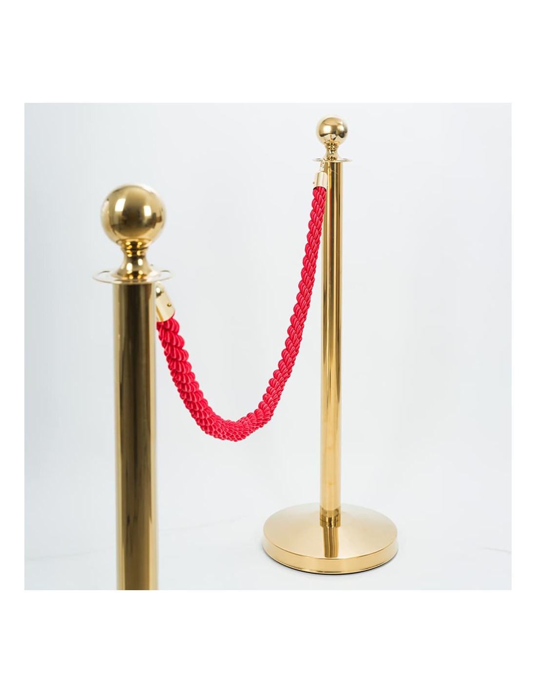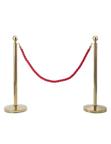 Pacote de 2 mastros catenários dourados e cordão vermelho trançado que formam um kit de separação perfeito para organizar clientes, entradas em áreas VIP, para museus ou para manter distância segura em estabelecimentos, lojas, escritórios ou locais públicos.