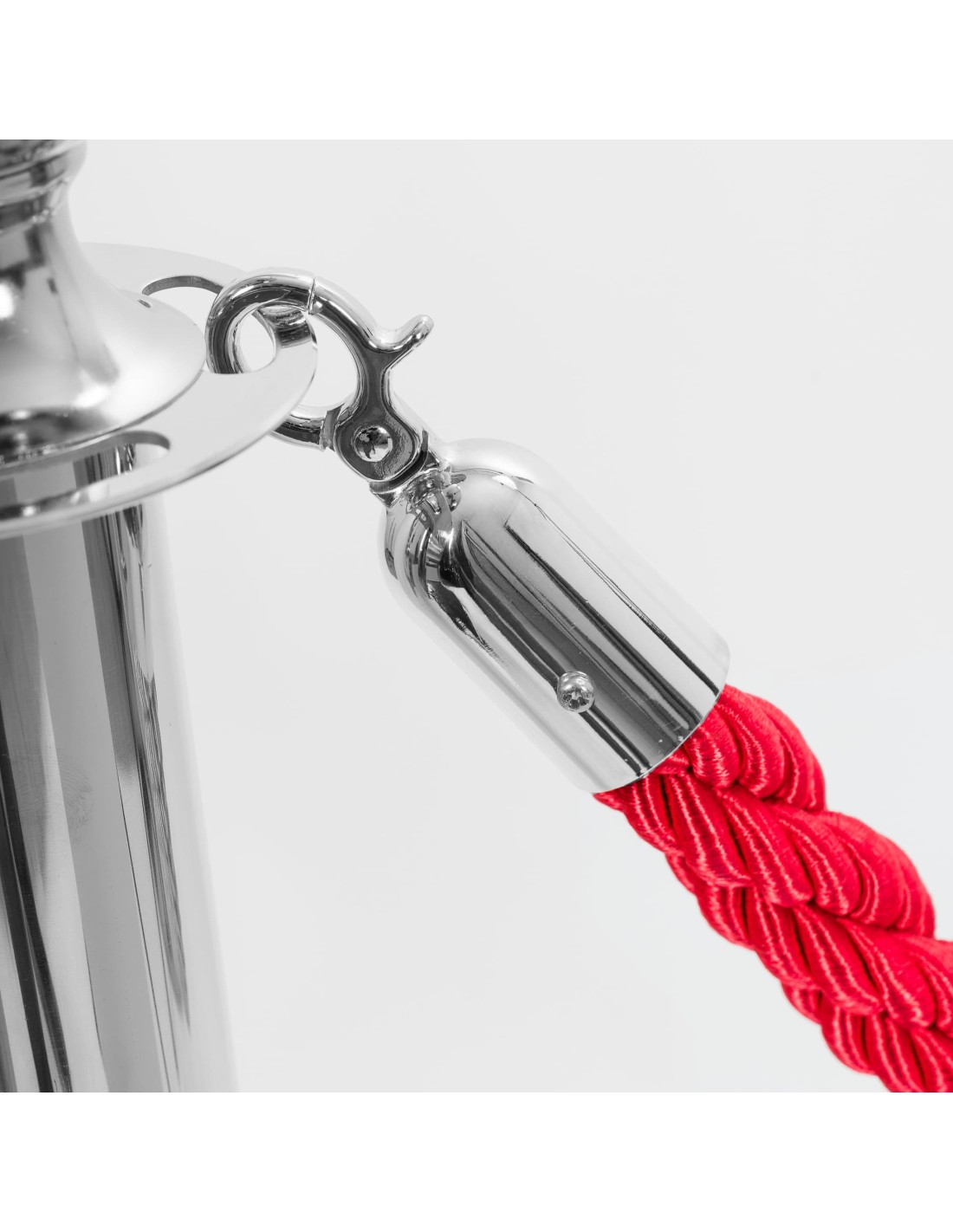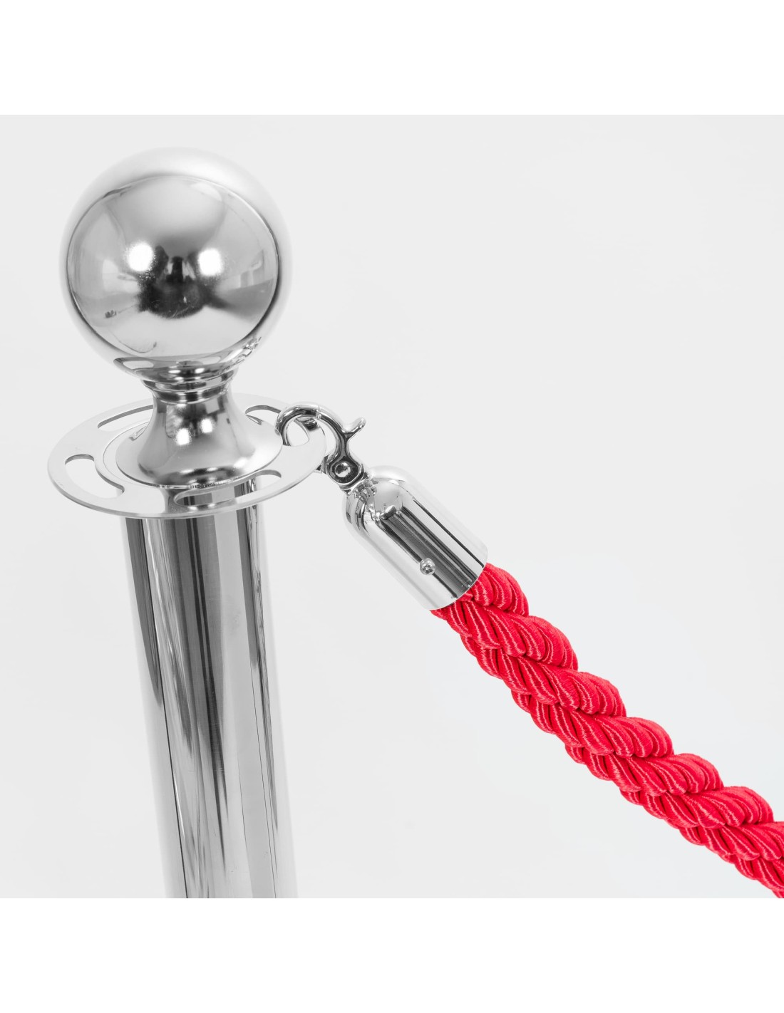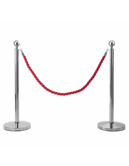 Pacote de 2 mastros catenários prateados e cordão vermelho trançado que formam um kit de separação perfeito para organizar clientes, entradas em áreas VIP, para museus ou para manter distância segura em estabelecimentos, lojas, escritórios ou locais públicos.