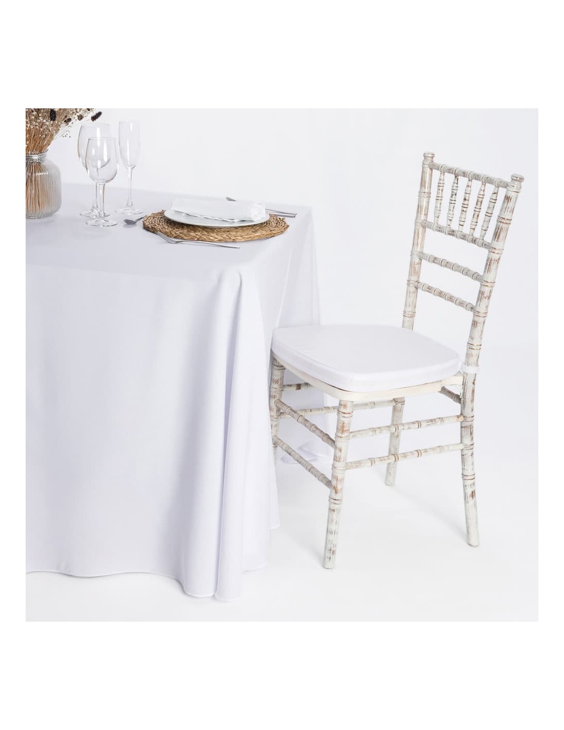 É confeccionado em 100% poliéster, um material que garante durabilidade e resistência. Este mantel, em uma elegante cor branca, é projetado para oferecer um acabamento sofisticado e impecável, ideal para eventos de alto padrão e estabelecimentos exclusivos.